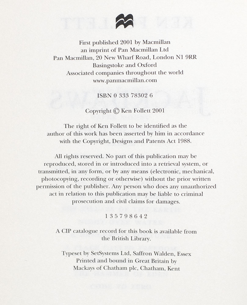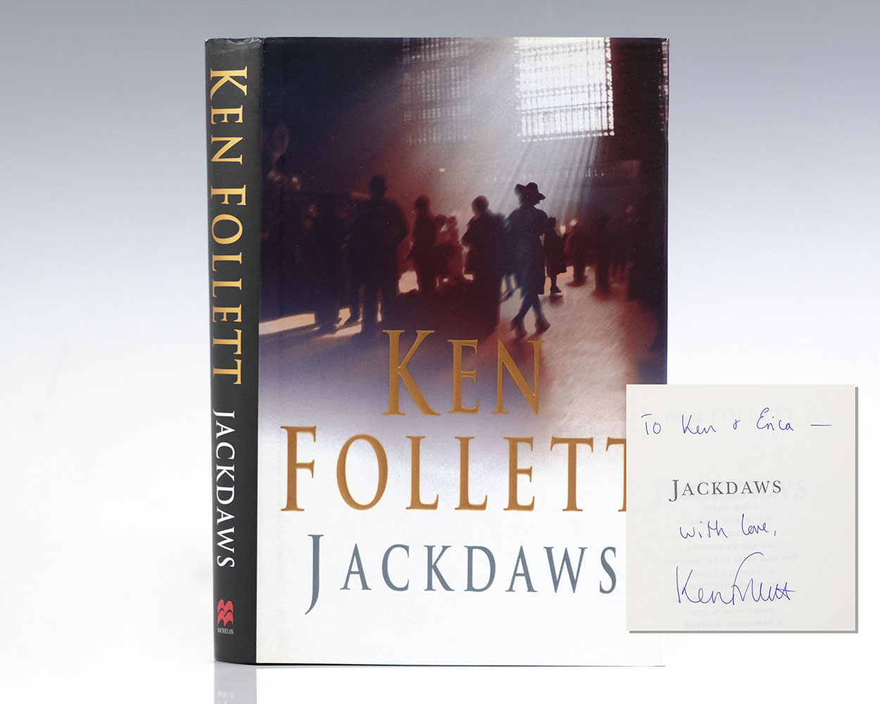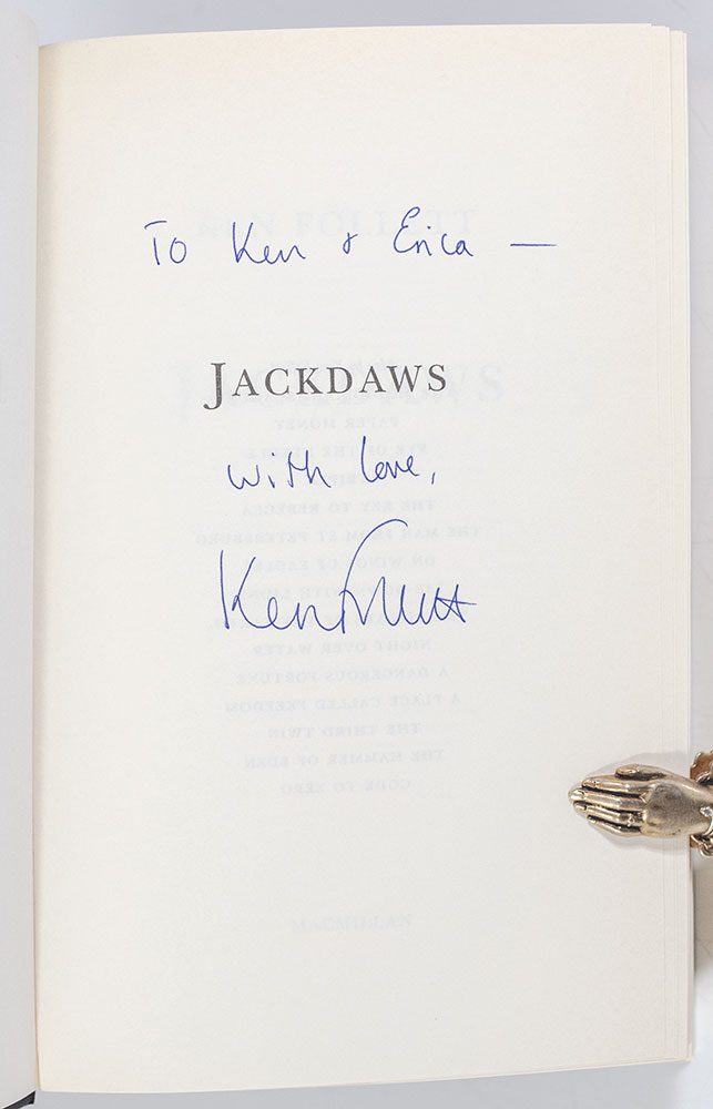 First edition of Ken Follett's Jackdaws; inscribed by him to Erica Jong