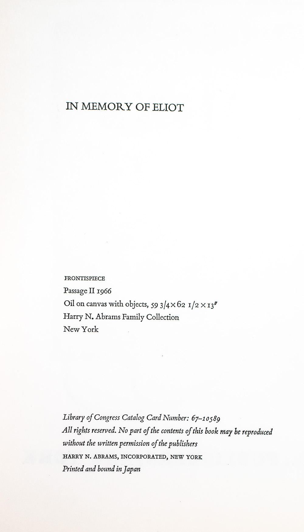 First edition of this early monograph on the work of Jasper Johns. Large oblong quarto, original cloth, text with 142 plates, half tipped-in color. Fine in a fine dust jacket.
