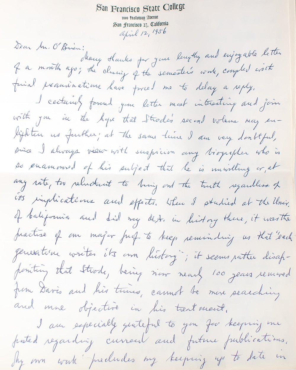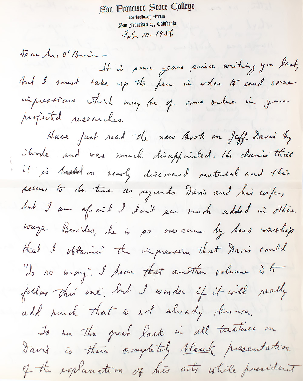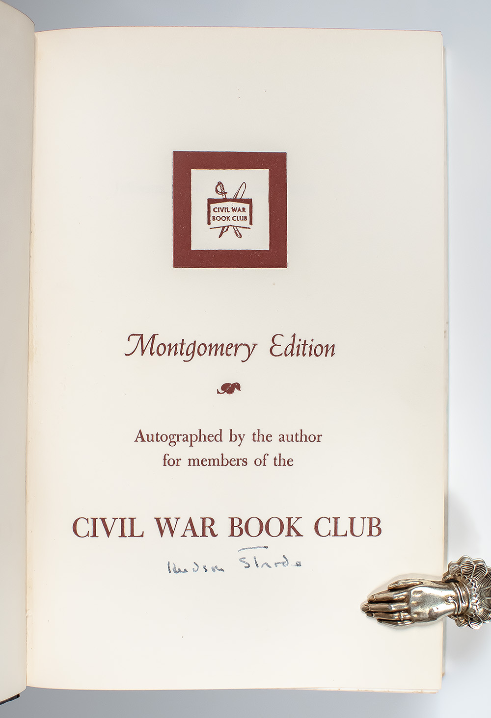 First editions of the complete set of the biography of the only president of the Confederate States. Octavo, four volumes, publisher's original half-cloth, top stains, frontispiece, with cartographic endpapers in Confederate President. Boldly signed by the author in three of the volumes: on the Montgomery Edition tipped in leaf for the Civil War Book Club in American Patriot, and on the front free endpapers of Tragic Hero and Private Letters. Each volume is near fine to fine in a near fine dust jackets. Accompanied by a correspondence between Carlos S. Mundt of San Francisco State College and a Mr. O'Brien regarding Strode's Jefferson Davis book laid in. Housed in a custom cloth slipcase. Rare and desirable signed.