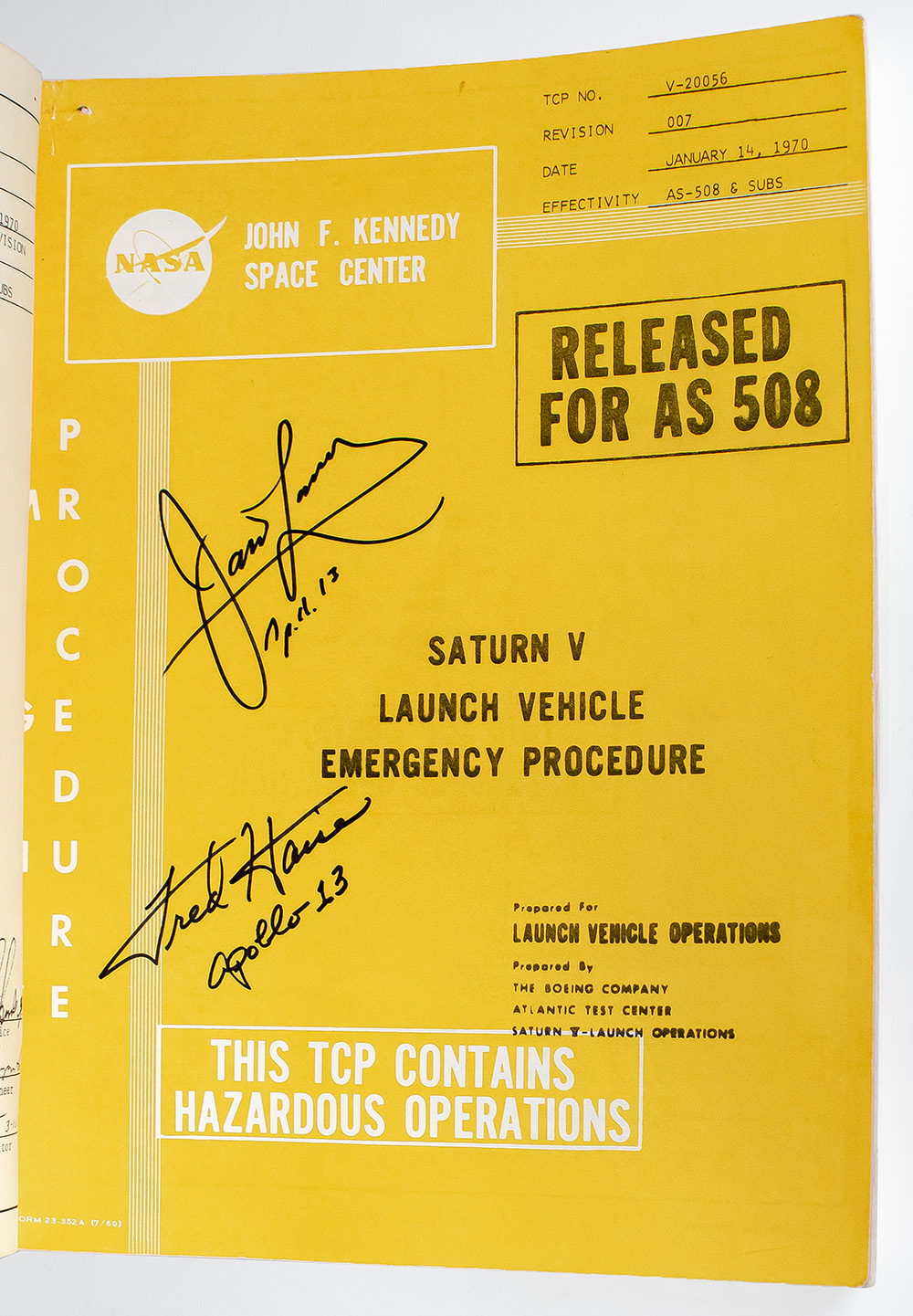 Rare original NASA Apollo 13 Saturn V Launch Vehicle Emergency Procedure Manual; signed by Apollo 13 Mission Commander Jim Lovell and Lunar Module Pilot Fred Haise