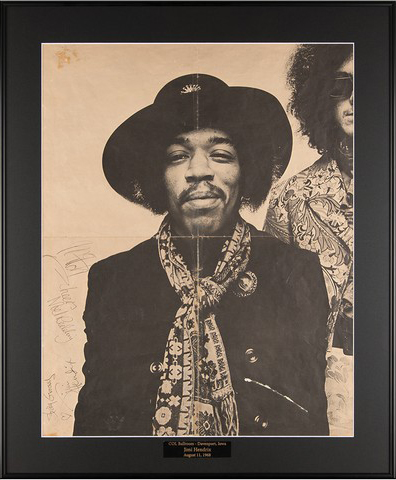 Vintage c. 1968 'Electric Last Minute' poster of Jimi Hendrix from Eye Magazine, boldly signed and inscribed, "Stay Groovy, Jimi Hendrix," "Cheers, Noel Redding," and "Mitch." Matted and framed. The poster measure 18.5 inches by 23.5 inches. The entire piece measures 24 inches by 28.5 inches. In very good to fine condition, with folding and tape along the intersecting folds. With a letter of provenance statement from the original recipient, noting that the autographs were acquired at the Col Ballroom in Davenport, Iowa, on August 11, 1968.