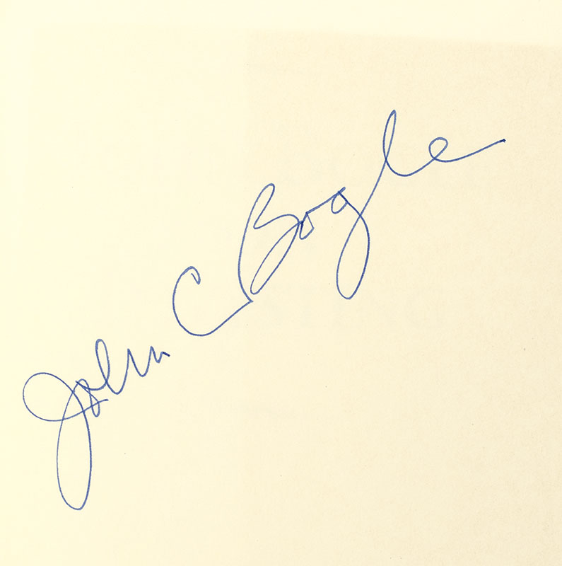 First edition of this collection of speeches by the incomparable money manager. Octavo, original half cloth. Boldly signed by John C. Bogle on the front free endpaper. Fine in a near fine dust jacket. Foreword by Paul A. Volcker.