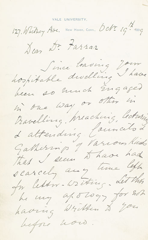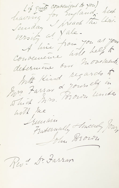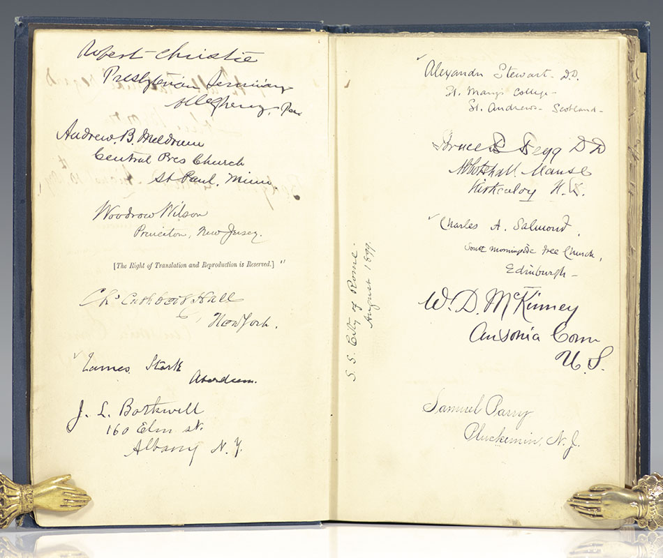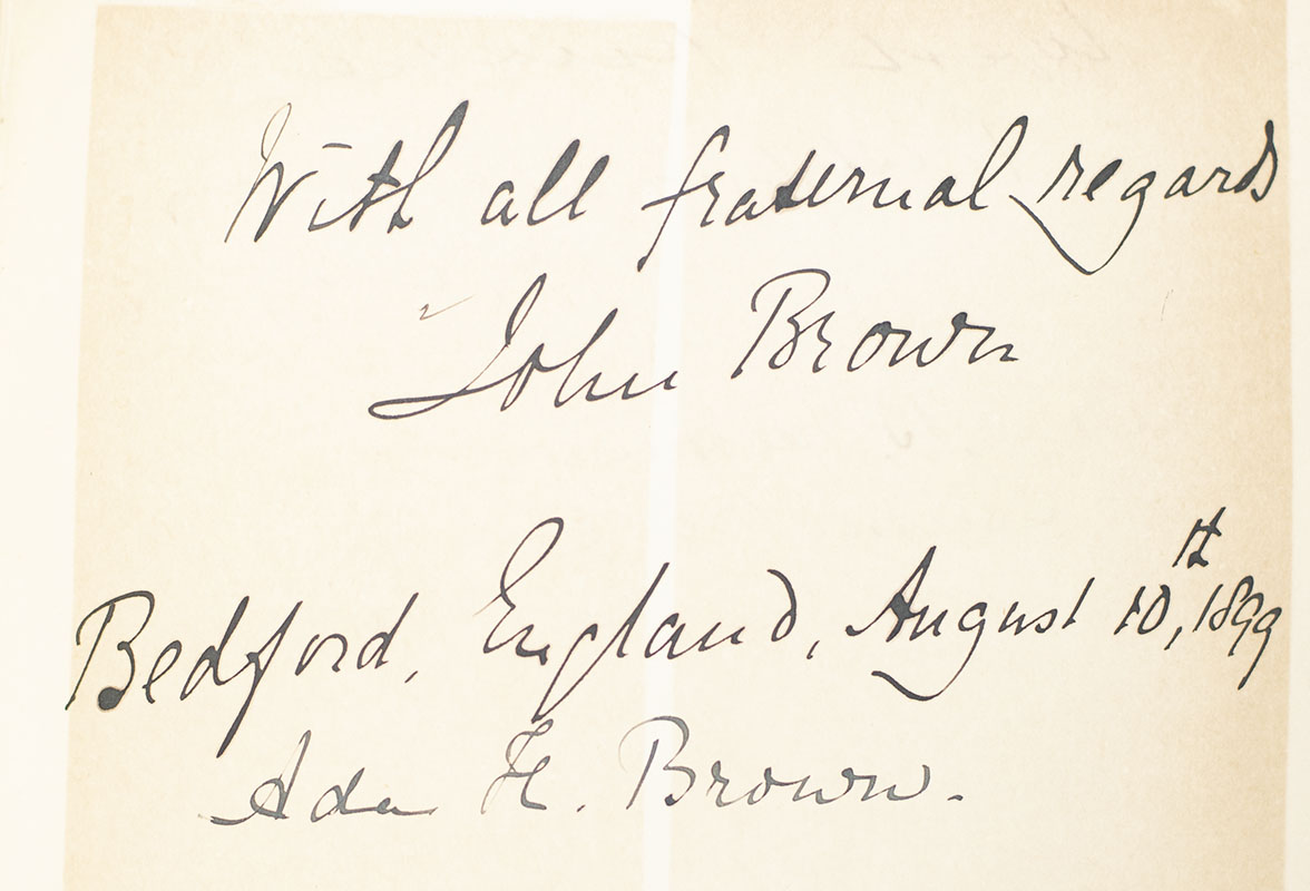 Early edition of Reverend John Brown's important biography of his predecessor and the author of Pilgrim's Progress, English Puritan preacher John Bunyan. Octavo, original cloth. Presentation copy, inscribed by the author on the half-title page, "With all fraternal regards John Brown Bedford, England, August 10th 1899" and signed by his wife, "Ada H. Brown." Additionally signed by Robert Christie, "Robert Christie Presbyterian Seminary Allegheny, Pa"; Woodrow Wilson, "Woodrow Wilson, Princeton, New Jersey"; Alexander Stewart "Alexander Stewart D.D. St. Mary's College- St. Andrews- Scotland-"; Charles A. Salmond, "Charles A. Salmond. South Morningside Free Church, Edinburgh-"; James Stark, "James Stark Aberdeen"; and Samuel Parry, "Samuel Parry Pluckemin N.J." With an additional autograph signed by Rev. John Brown tipped in on Yale University Letterhead dated Oct. 19th 1899and addressed to Rev. Dr. Farrar, a schedule of Brown's Lectures in Yale Divinity School and several clippings related to Bunyan and Brown's work. In very good condition. Housed in a custom half morocco and chemise case. A unique collection of signatures.
