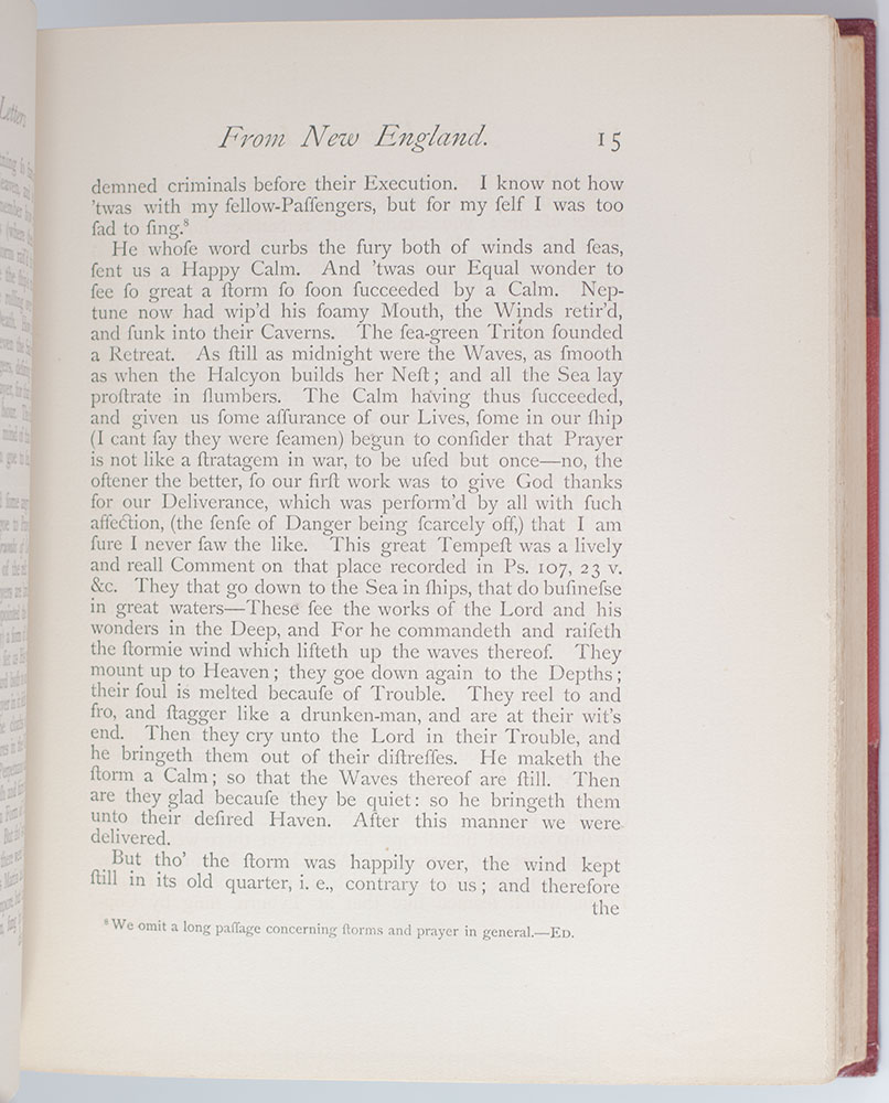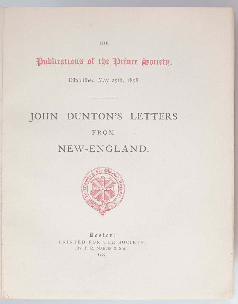 The Prince Society edition of Dunton's letters from New England. Octavo, bound in three quarters morocco, gilt titles and tooling to the spine in six compartments within raised gilt bands, top edge gilt. One of twenty numbered copies printed on large paper, this is number 5. In very good condition.