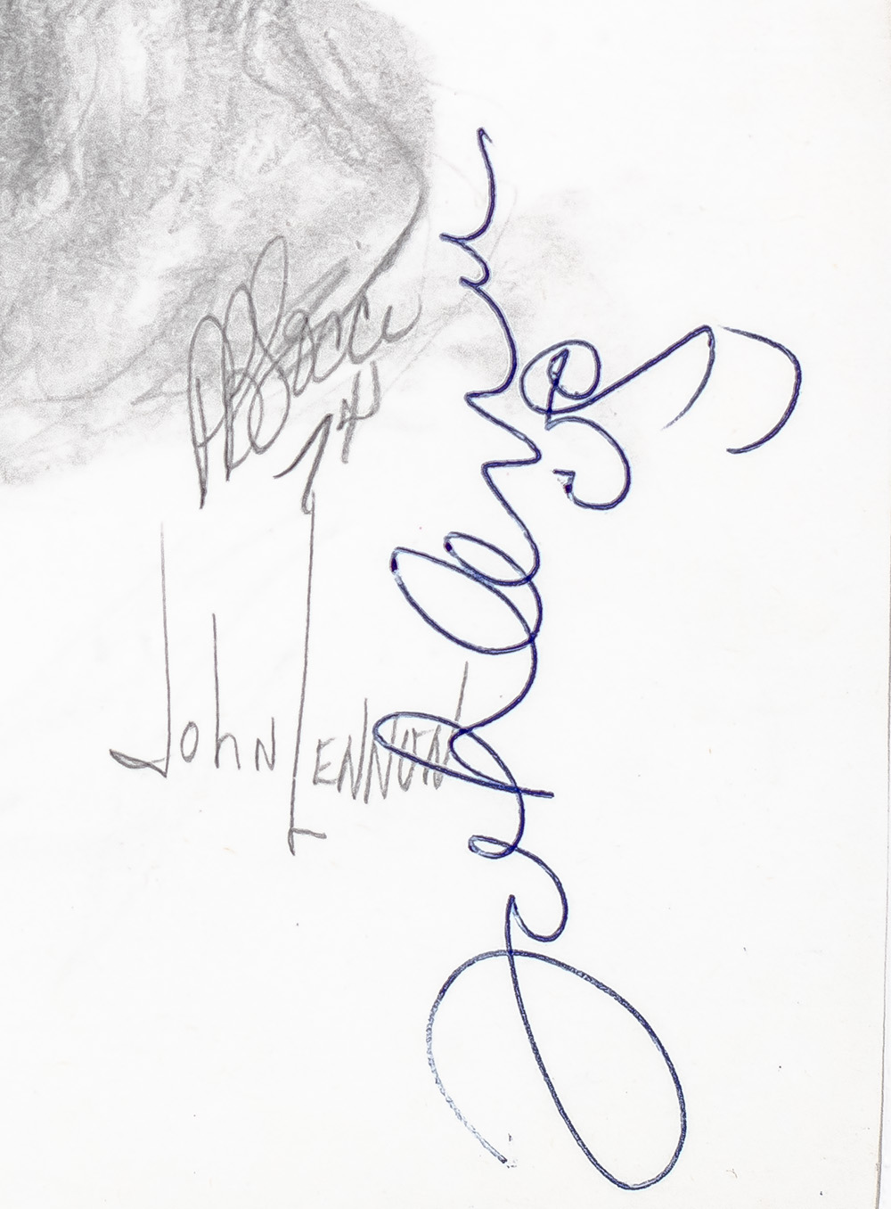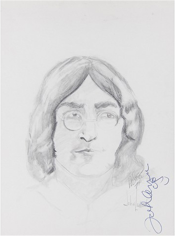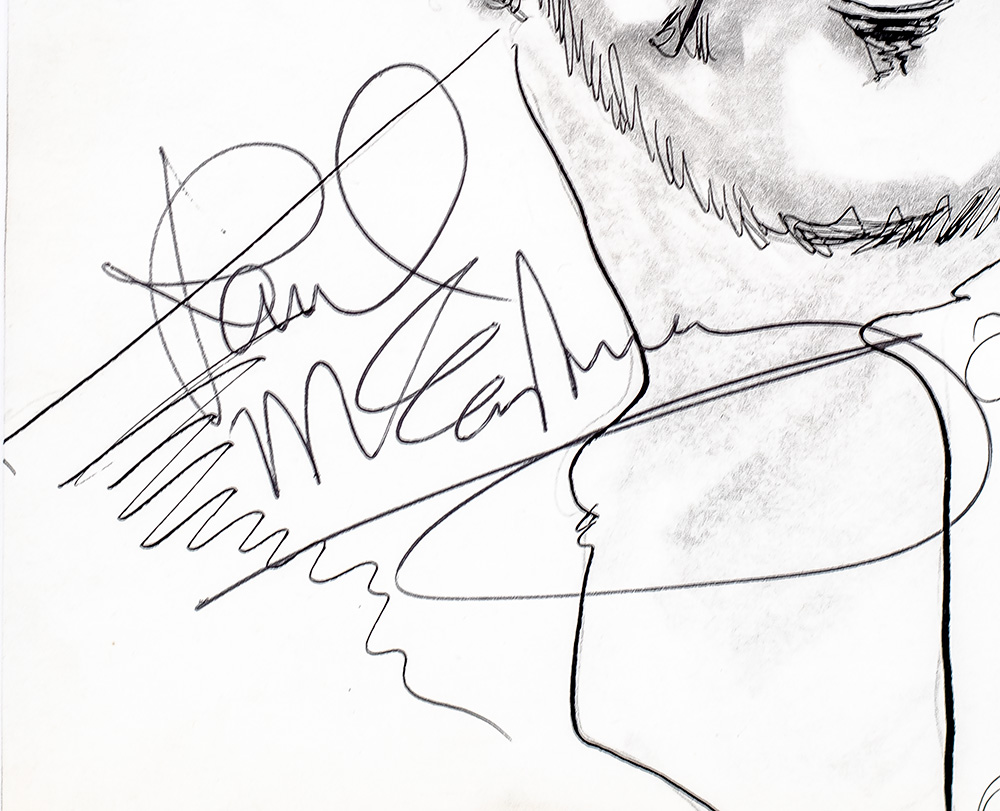 Rare graphite artist’s sketches of Beatles legends John Lennon and Paul McCartney by American artist Pat B. Socci. Signed by John Lennon vertically with an added self-caricature and Paul McCartney on their respective portraits and additionally signed by artist P.B. Socci. Active in the mid 1970s, American artist Pat B. Socci gained a reputation for seeking out Hollywood icons to sign his sketched portraits. Pencil notation to the verso of the Lennon portrait (now obscured by the frame's backing), stating that Lennon's signature was obtained at the "Carlyle Hotel, Sgt. Pepper Premiere Night, 11-17-74." The McCartney signature was obtained in person on November 23, 1974, at the Stanhope Hotel in New York City. In fine condition. Double matted and framed. Each sketch measures 8.5 inches by 11.75 inches. The entire piece measures 18 inches by 24.5 inches.