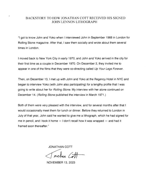 Rare Bag One lithograph signed by Beatles icon John Lennon. One page, the title page from Lennon's Bag One Portfolio. Signed by him beneath the image. From the collection of Jonathan Cott, author and editor of numerous books, predominately focusing on music and who has written articles for varied publications such as Rolling Stone, The New York Times, The New Yorker, The Los Angeles Times, The Village Voice, Vogue, Esquire and The Wall Street Journal. This was presented by John Lennon to Jonathan Cott, who interviewed Lennon and Yoko Ono several times, and whose December 5, 1980 interview with Lennon was the final solo interview conducted before his death on December 8th of that year. Lennon had created the "Bag One" drawings depicting his wedding and honeymoon with Yoko Ono and presented them to her in 1969. Framed. Rare and desirable and with noted provenance.