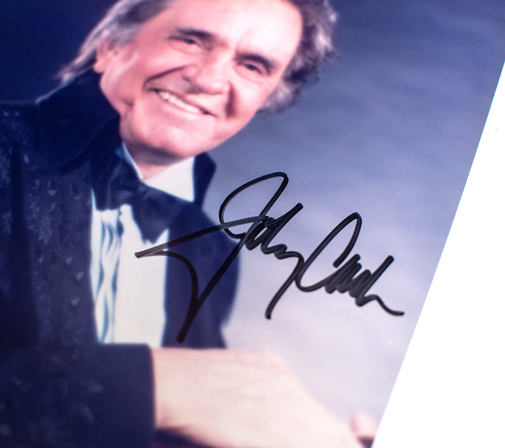 Fine full color matte portrait of Johnny Cash, boldly signed by him. The photograph shows a middle-aged Cash in his black western suit and bowtie. Johnny Cash’s identity as “The Man in Black” extended beyond mere fashion into a profound moral and cultural statement. His consistent choice to wear black attire—typically a tailored Western suit, dark dress shirt, and bolo tie—served as a symbolic expression of solidarity with the marginalized and oppressed. In his 1971 song “Man in Black,” Cash articulated this philosophy explicitly, stating that he wore black “for the poor and the beaten down,” and “for the prisoner who has long paid for his crime.” Through this self-styling, Cash transformed clothing into an act of protest, rejecting the bright rhinestone glamour of mainstream country music in favor of a sober visual code that aligned with his themes of sin, redemption, and social conscience. The black suit functioned as both uniform and metaphor: it embodied his empathy for the downtrodden, his critique of injustice, and his enduring hope for a brighter moral order. In academic terms, Cash’s attire can be understood as a performative expression of cultural resistance—an aesthetic of mourning and defiance that fused personal identity with social ethics. In fine condition.