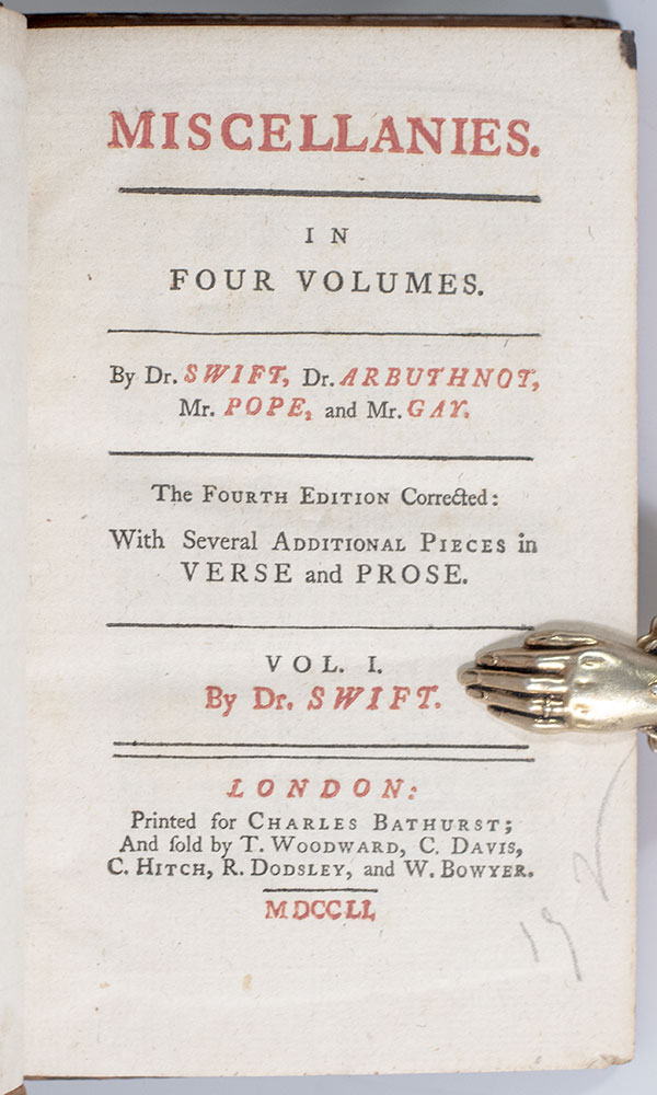 Finely bound volumes of the works of Jonathan Swift. Octavo, 19 volumes, bound in contemporary calf, red morocco spine labels, gilt titles to the spine. In near fine condition, with the Cornwell House ink stamp to front free endpaper. A very sharp set.