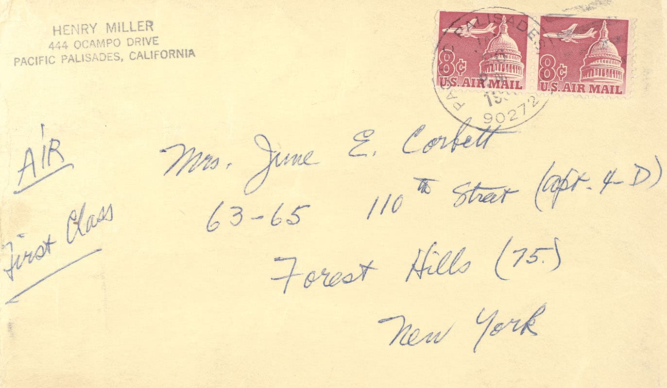 First edition of Miller's short illustrated work on a visit to St. Remy in the South of France. 12mo, original wrappers as issued, illustrated. One of only 2000 copies. Association copy, inscribed by the author on the verso of the front panel to his second wife, June Mansfield, "For June, All the best! Henry 1/16/67." In fine condition. Miller's second wife, June, convinced him to commit to writing full time and became the inspirations for most of his best known works including Tropic of Cancer. After they divorced in 1934, they remained close friends and Miller continued to send his new works to her for many decades to come. With the original transmittal envelope addressed to Mrs. June E. Corbett in Miller's hand. Housed in a custom half morocco clamshell box. A significant association, most rare and desirable.