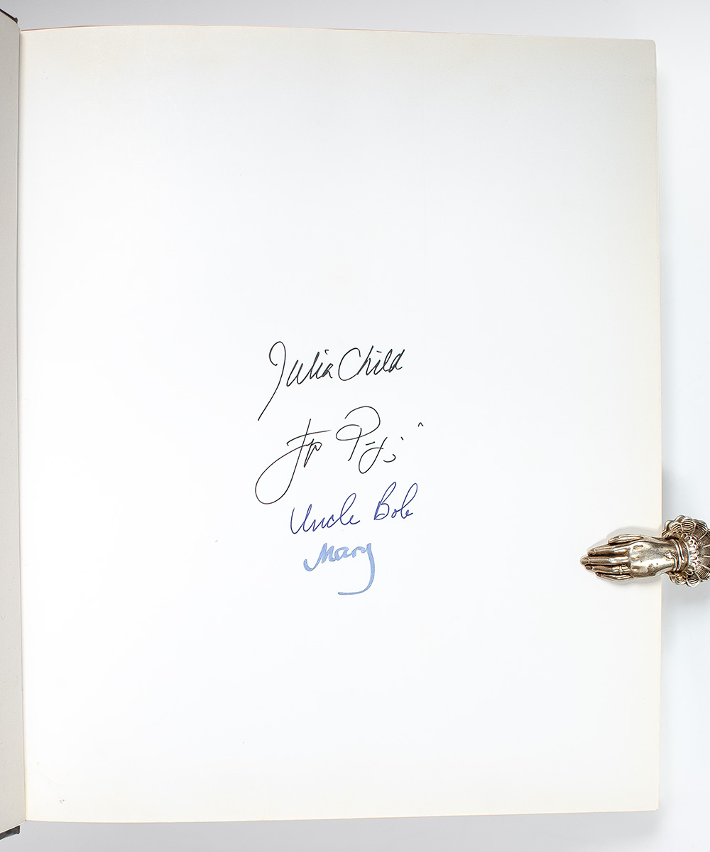 First edition of this work by these two legendary chefs. Quarto, original boards, illustrated with 328 color photographs by Christopher Hirsheimer. Boldly signed by Julia Child and Jacques Pepin on the front flyleaf. Additionally signed "Uncle Bob" and "Mary" below. Near fine in a very good price-clipped dust jacket. Jacket design by Carol Devine Carson.