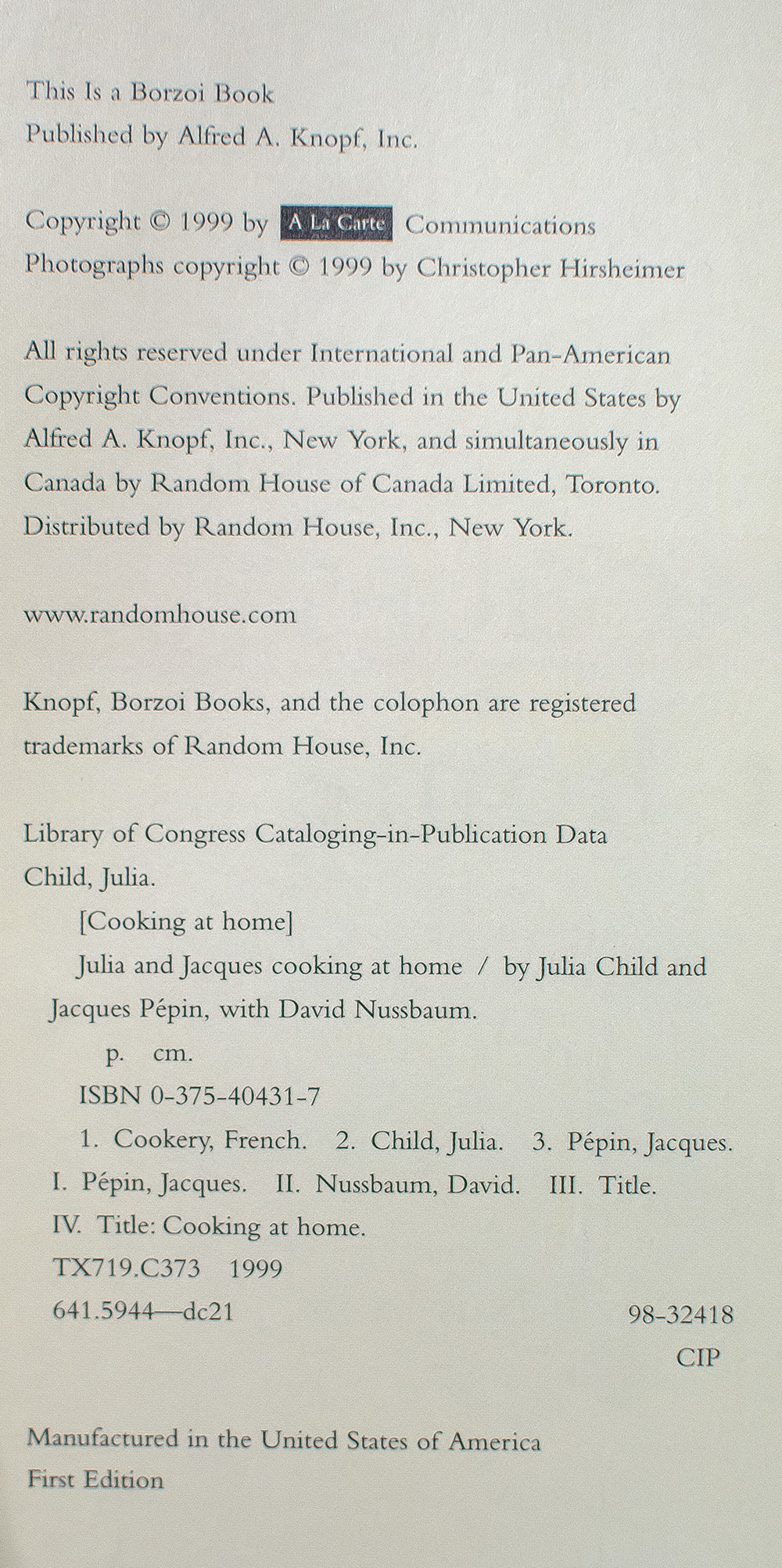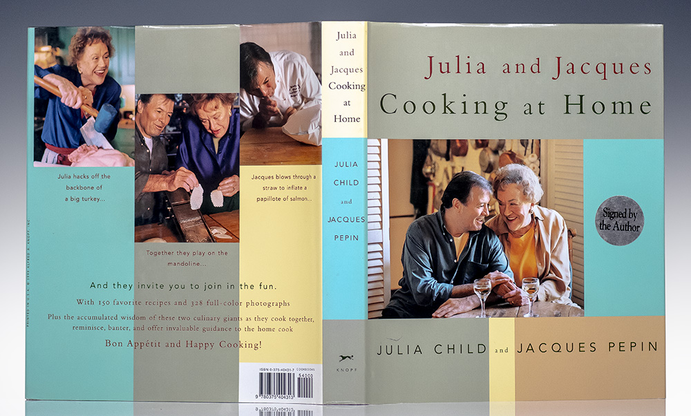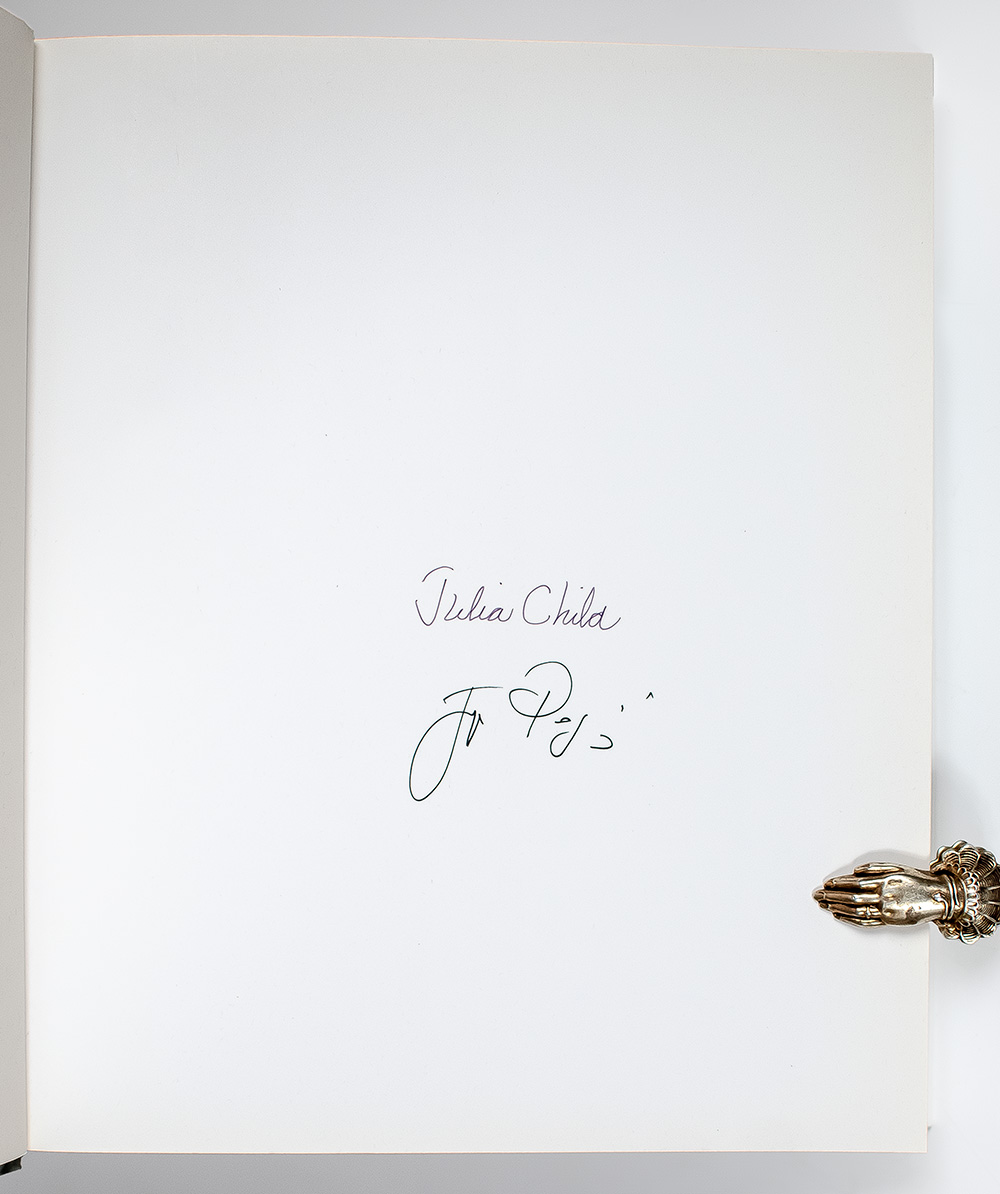 First edition of this work by these two legendary chefs. Quarto, original boards, illustrated with 328 color photographs by Christopher Hirsheimer. Signed by both Julia Child and Jacques Pepin on the second free endpaper. Fine in a fine dust jacket. Jacket design by Carol Devine Carson.