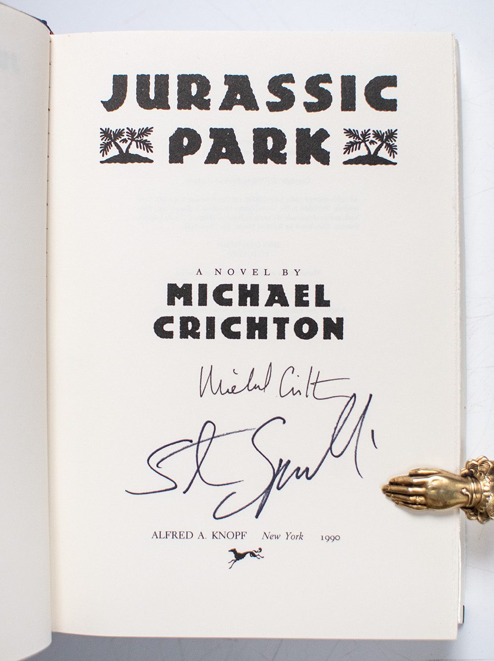 First edition of Crichton's gripping, bestselling scientific thriller, basis for the film directed by Steven Spielberg. Octavo, original half cloth. Boldly signed by Michael Crichton and Steven Spielberg on the title page and signed with an original drawing of the iconic dust jacket dinosaur by jacket designer Chip Kidd opposite the title page, again on the front jacket panel and on the rear flap. Spielberg directed the 1993 film bearing the same name. Fine in a fine dust jacket. Jacket design by Chip Kidd. Rare and desirable signed by both Crichton and Spielberg in addition to Kidd.