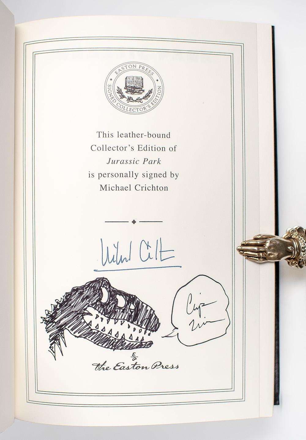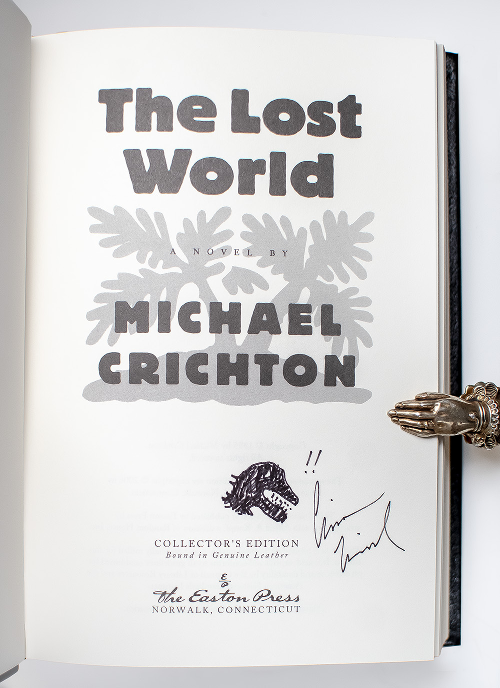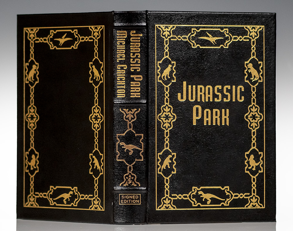 Signed limited first editions of Crichton's gripping, bestselling scientific thriller and its sequel The Lost World. Octavo, 2 volumes, original leather, gilt titles and tooling to the spine, front and rear panels, raised bands, all edges gilt, marbled endpapers, ribbon bound in. Jurassic Park is signed by Michael Crichton and with an original drawing of the iconic dust jacket dinosaur by jacket designer Chip Kidd in each volume. In fine condition. Rare and desirable.