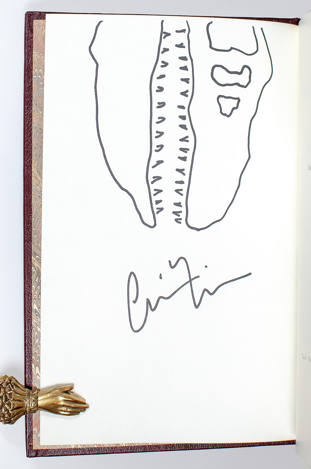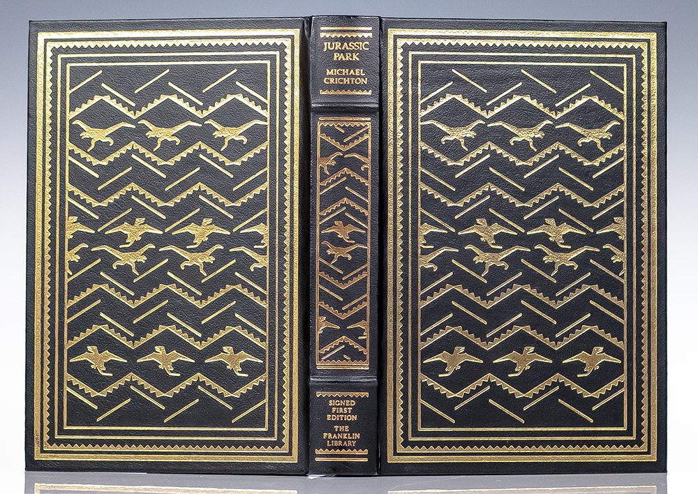 Signed limited first editions of Crichton's gripping, bestselling scientific thriller and its sequel The Lost World. Octavo, 2 volumes, original leather, gilt titles and tooling to the spine, front and rear panels, raised bands, all edges gilt, marbled endpapers, ribbon bound in. Both volumes signed by Michael Crichton and with an original drawing of the iconic dust jacket dinosaur by jacket designer Chip Kidd in each volume. In fine condition. Rare and desirable.