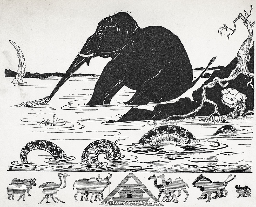 Just So Stories has “achieved nursery immortality because a genius has married two of the most tried and trusted favorite media—the fable and the fairy-story” (Muir, 107). “Kipling’s own witty black-and-white drawings… together with their extensive and ridiculous captions, are one of the chief delights of the book” (Carpenter & Prichard, 285).