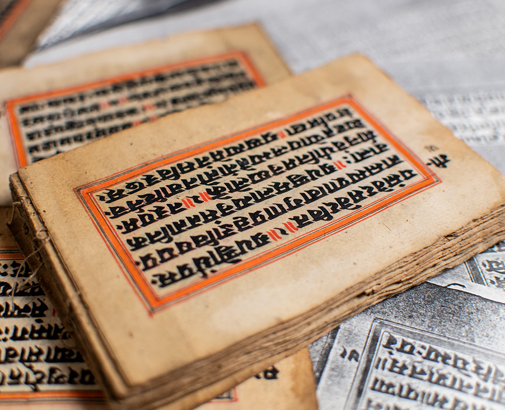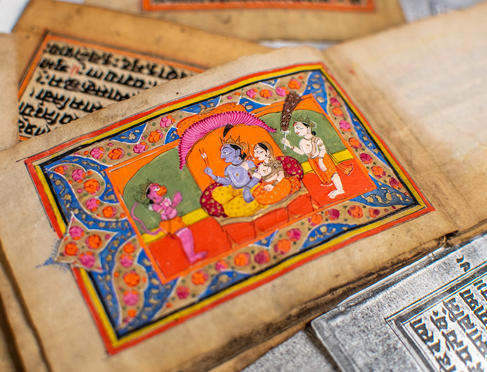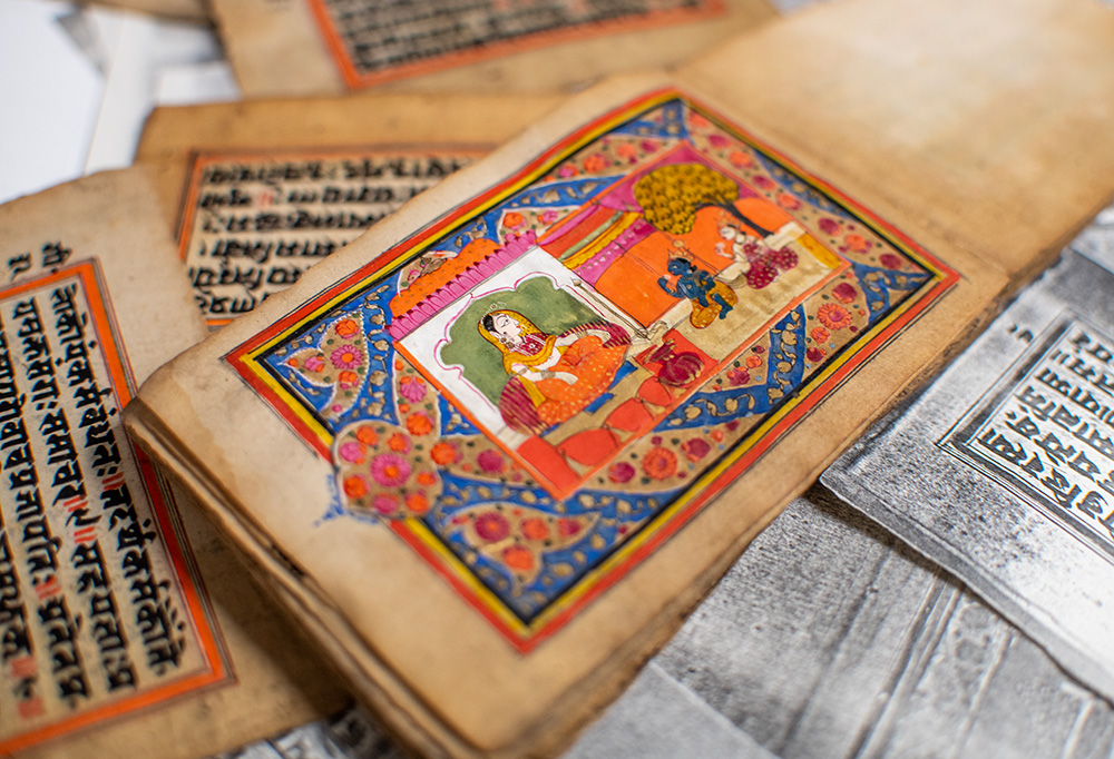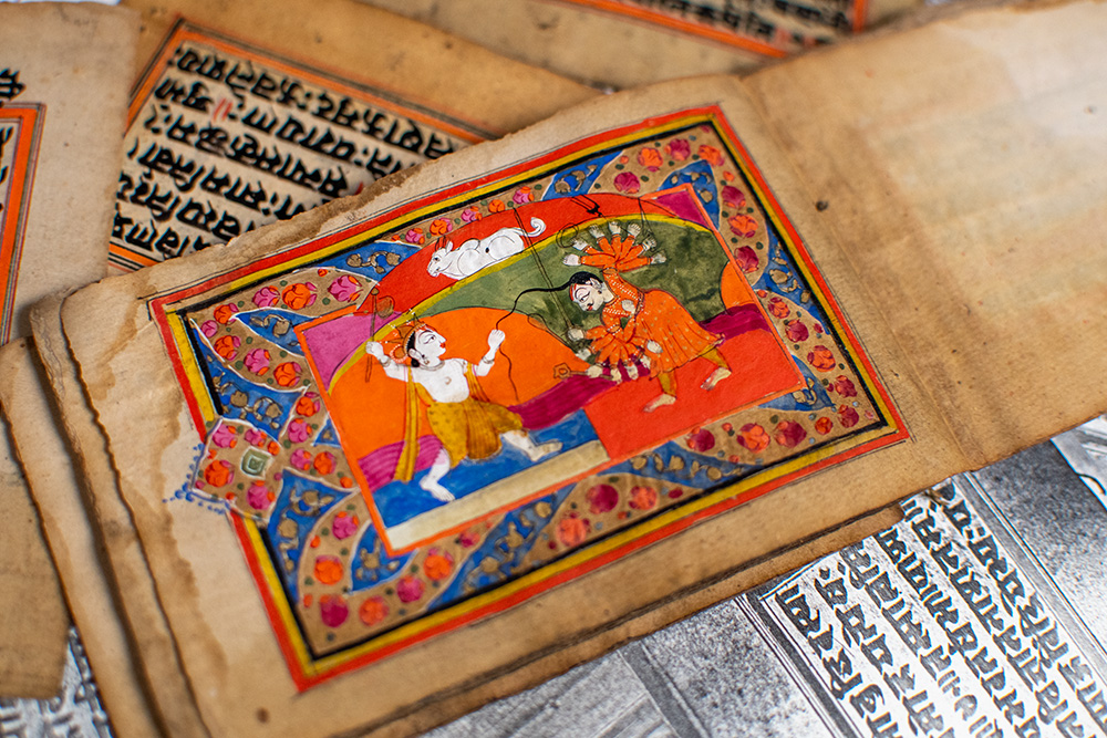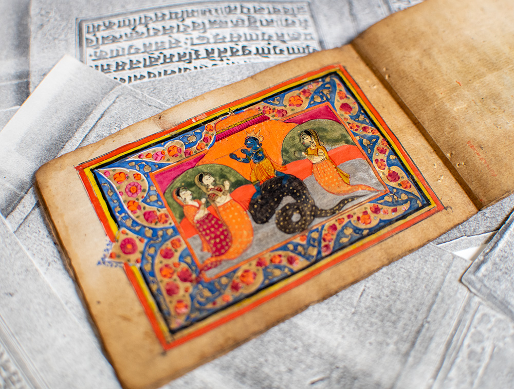 Illustrated Sanskrit manuscript of the definitive ancient Indian Hindu guide to the philosophy of love and desire. Late 19th century or earlier, bound accordion style. Twenty-three leaves, Sanskrit text in black ink with 15 original full-color erotic paintings with elaborate gilt decoration. In very good condition. Each leaf measures 5.25 inches by 3.25 inches. Rare and desirable.