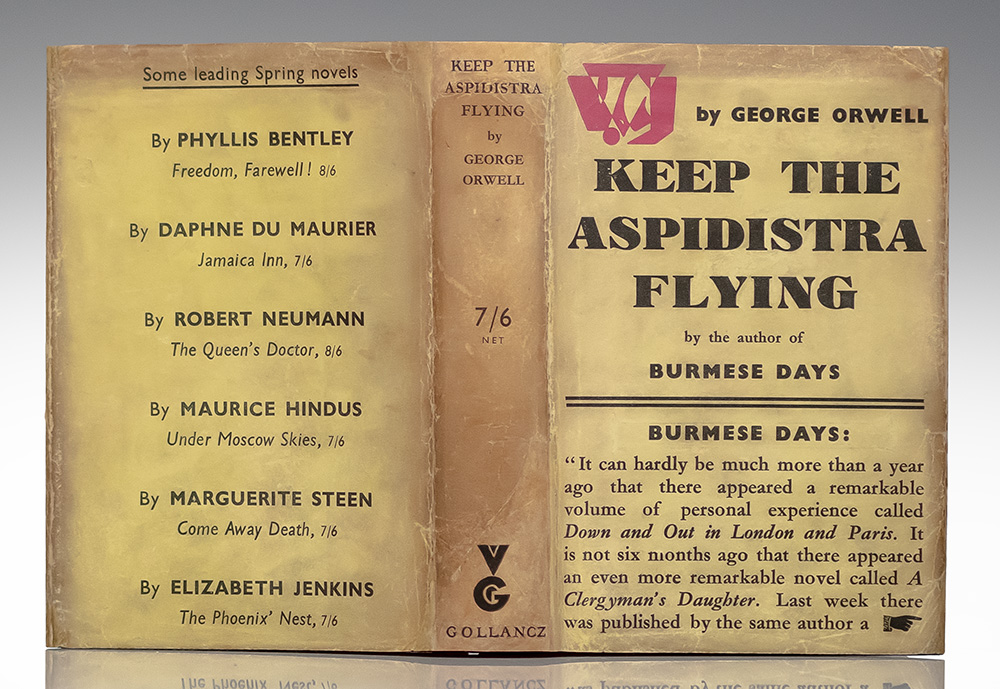 “What he realised, and more clearly as time went on, was that money-worship has been elevated into a religion": First edition of George Orwell's Keep the Aspidistra Flying; In the Rare Original Dust Jacket
