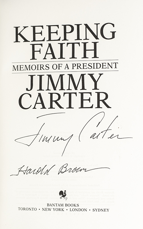 First edition of the 39th President of the United States' memoirs. Octavo, original cloth, illustrated. Signed by Jimmy Carter and Secretary of Defense Harold Brown on the title page. Brown was the U.S. Secretary of Defense from 1977 to 1981 in the cabinet Jimmy Carter. He had previously served in the John F. Kennedy and Lyndon Johnson administrations as Director of Defense Research and Engineering and Secretary of the Air Force. In the last stages of the Cold War, as Secretary of Defense, he set the groundwork for the Camp David accords. Near fine in a very good dust jacket. Rare and desirable signed by Carter and Brown.