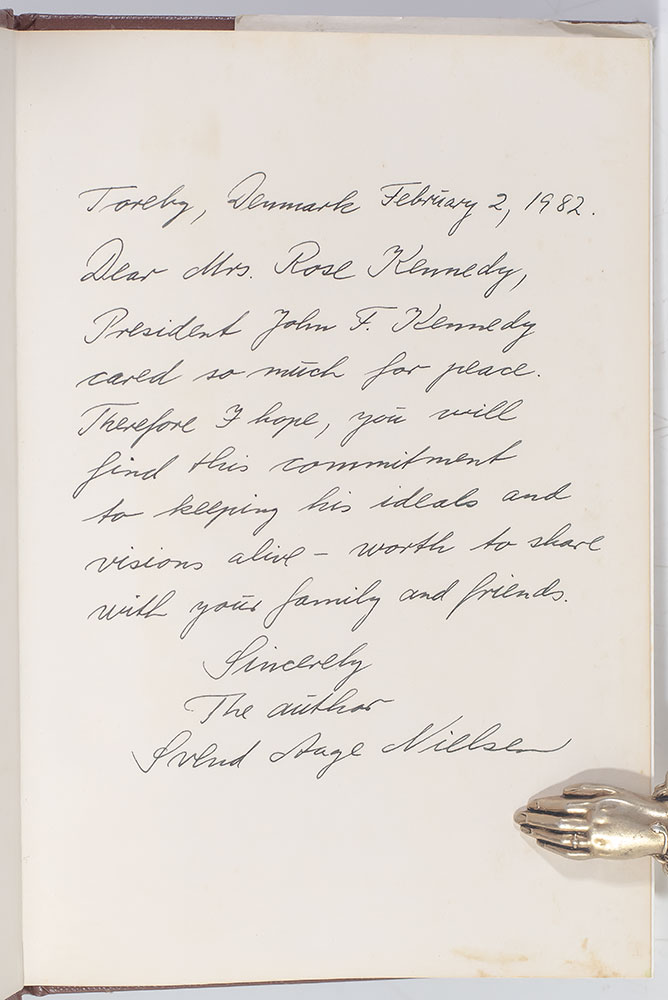 First edition of this work by the founder of The Kennedy Society of Denmark. Octavo, original cloth, illustrated. Association copy, lengthily inscribed by the author on the front free endpaper, "Toreby Denmark February 2, 1982. Dear Mrs. Rose Kennedy, President John F. Kennedy cared so much for peace. Therefore I hope, you will find this commitment to keeping his ideals and visions alive - worth to share with your family and friends. Sincerely The author Svend Aage Nielsen." The recipient, Rose Kennedy, was the matriarch of the Kennedy family: the wife of Joseph P. Kennedy Sr. and mother of John F. Kennedy and his eight siblings. She was a devout catholic and deeply embedded in the "lace curtain" Irish American community in Boston. After her son John was elected president in 1960, Rose "became a sort of quiet celebrity" and appeared on the International Best Dressed List. Most of her social activities consisted of involvement in charities and women's groups. Very good in a very good dust jacket. An exceptional association.