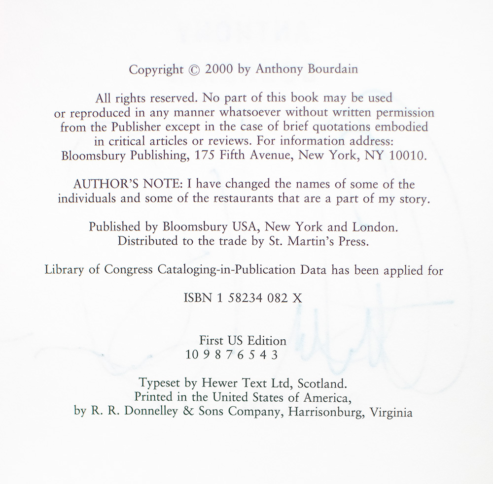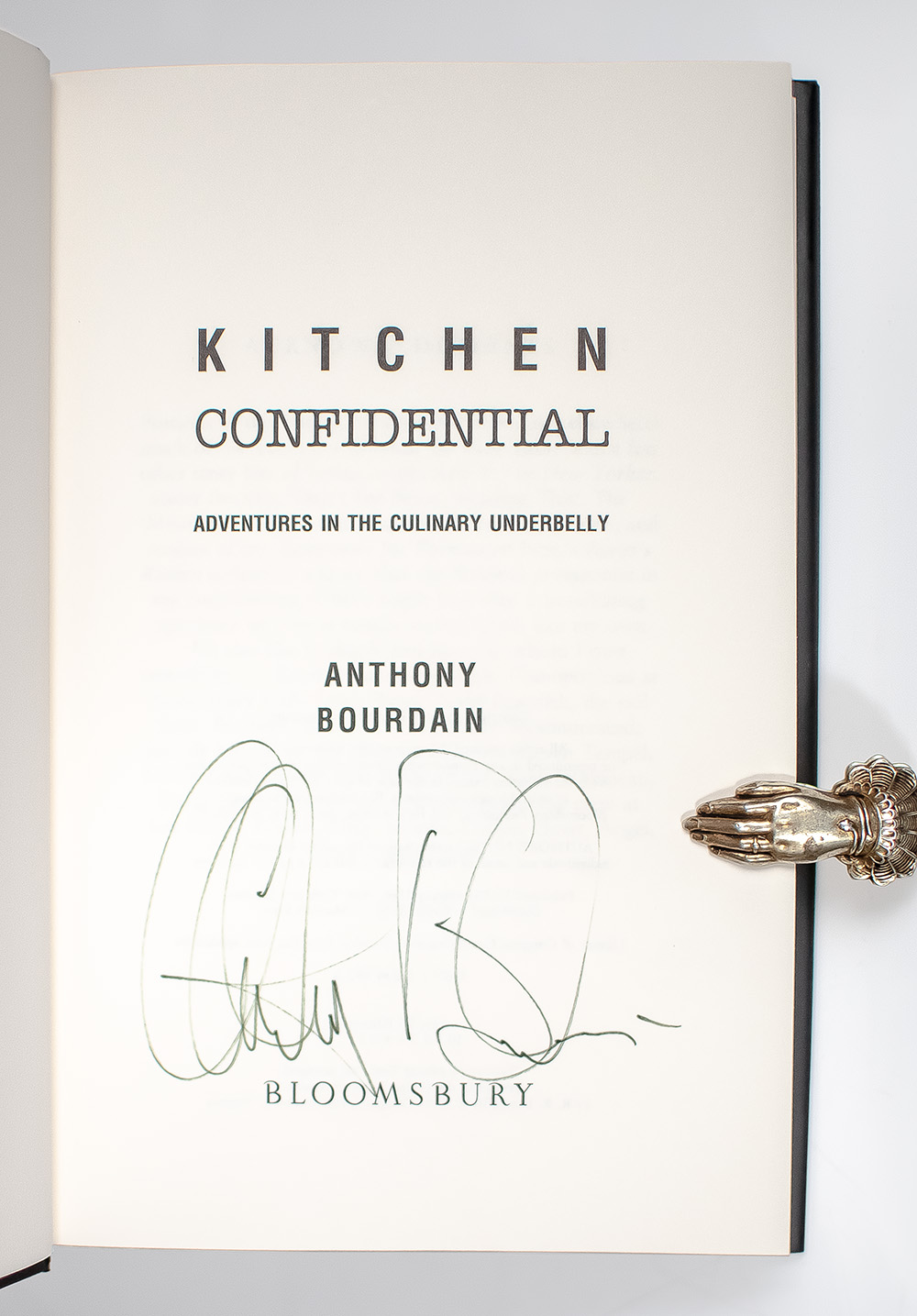 First edition, third printing of the legendary chef's bestselling memoir and first work of non-fiction. Octavo, original boards. Boldly signed by Anthony Bourdain on the title page in a contemporary full signature. Fine in a fine dust jacket. Jacket design by Notice 51.