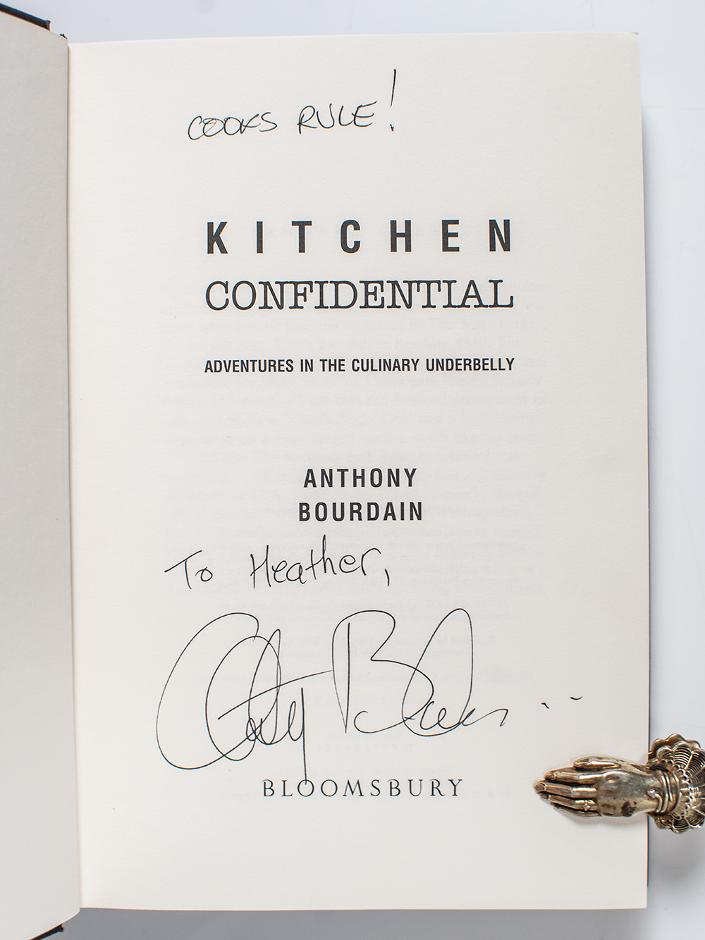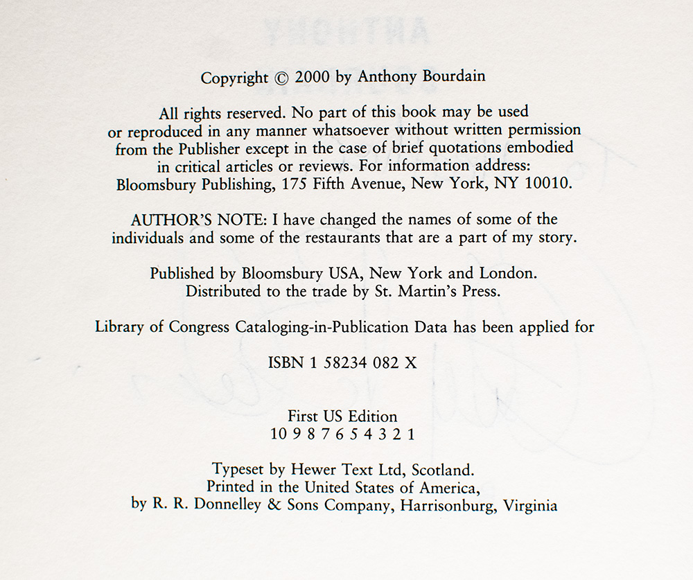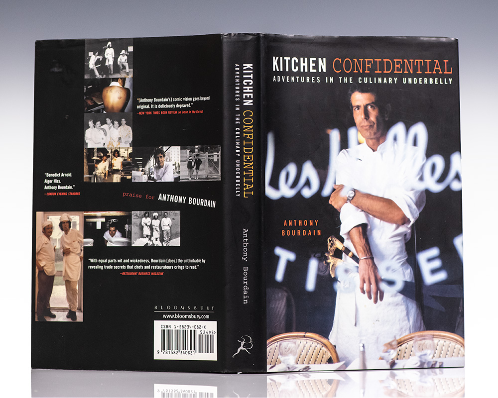 First edition of the legendary chef's bestselling memoir and first work of non-fiction. Octavo, original boards. Presentation copy, inscribed by the author on the title page in a contemporary full signature, "Cooks Rule! To Heather Anthony Bourdain." Fine in a fine dust jacket. Jacket design by Notice 51. Rare and desirable signed and inscribed.