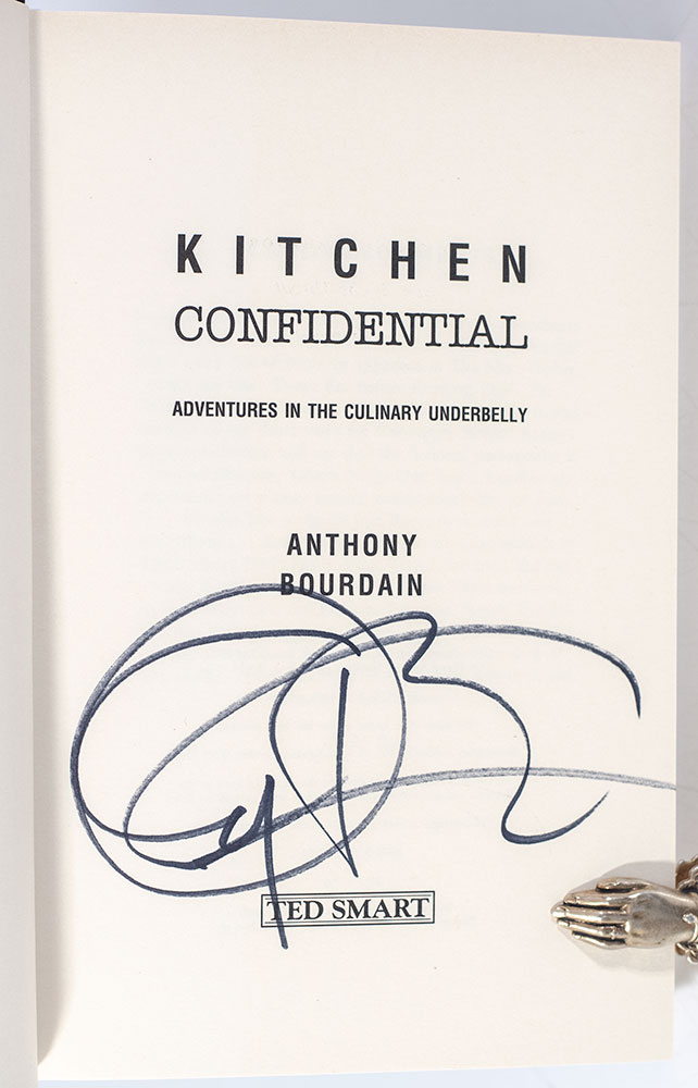 Early British printing of the legendary chef's bestselling memoir and first work of non-fiction. Octavo, original boards. Signed by Anthony Bourdain on the title page. Fine in a fine dust jacket. Author photograph by Geri Cimbalala/ Villard.