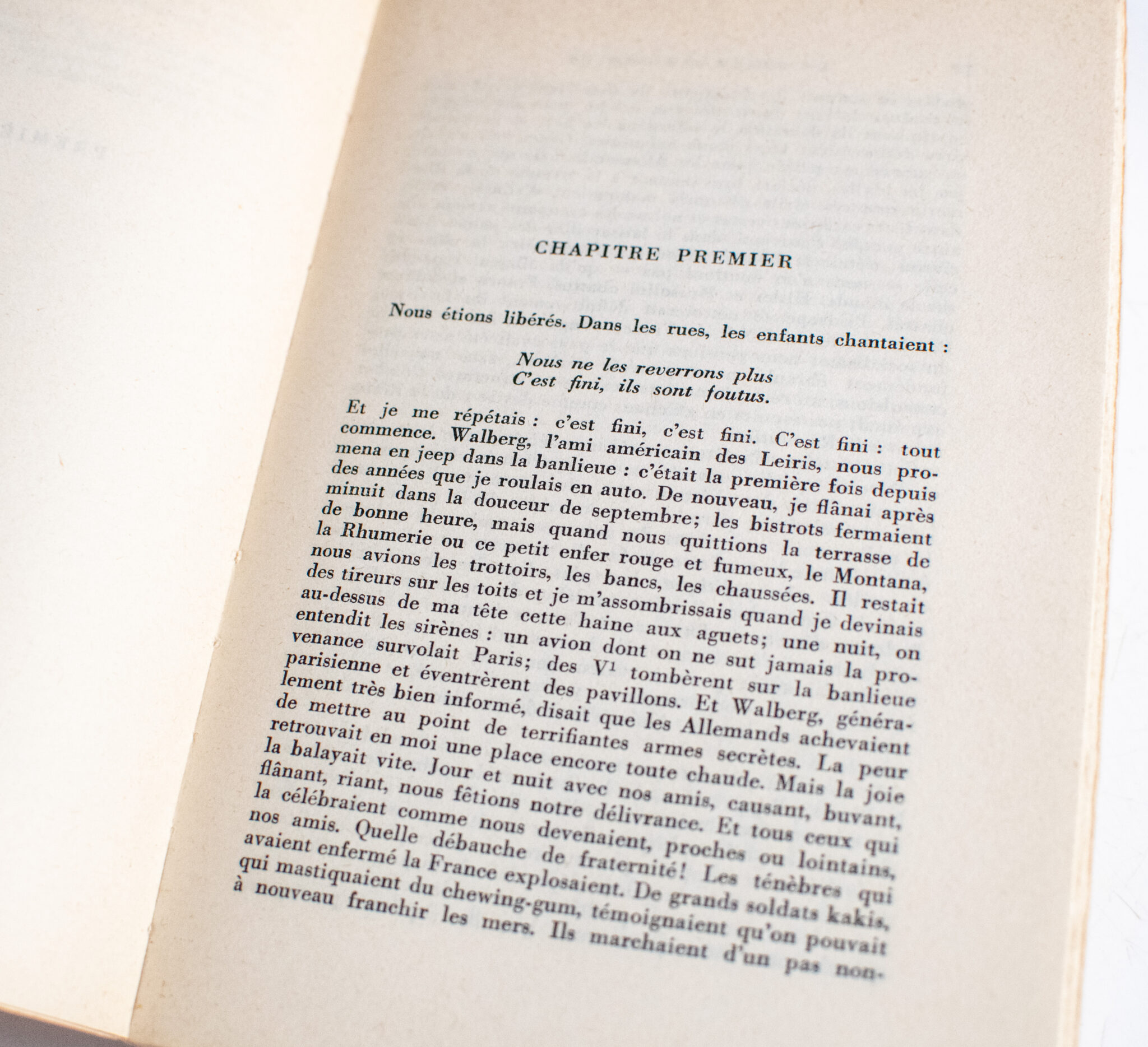 First edition of Simone de Beauvoir's autobiographical memoir covering the years after World War II. Octavo, written in French, original publisher’s wrappers. In near fine condition with light bumping. Ownership signature to the front free endpaper.