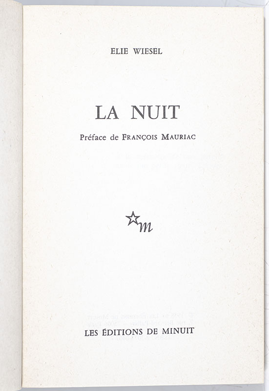 Early printing of Wiesel's first book. Octavo, original wrappers. Signed by Elie Wiesel on the half-title page. Preface by Francois Mauriac. Near fine in wrappers.