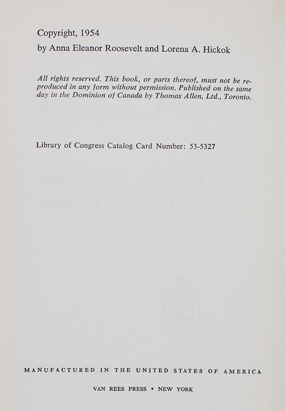 First edition of Roosevelt and Hickok's tribute to women in America. Octavo, original cloth. Signed by both Eleanor Roosevelt and Lorena Hickok on the half-title page. Very good in a very good dust jacket with some wear to the extremities. Uncommon signed.