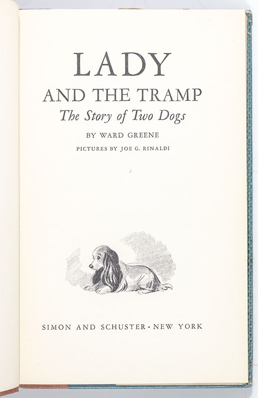 First edition of Lady and the Tramp. Octavo, original cloth, with charming illustrations by Joe G. Rinaldi. Foreword by Walt Disney. Fine in a good dust jacket with some chips and wear.