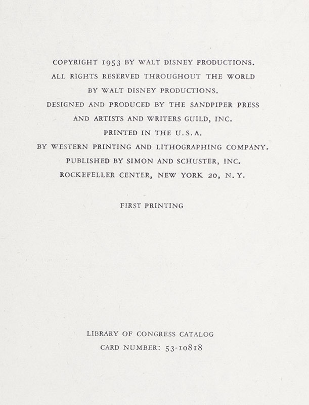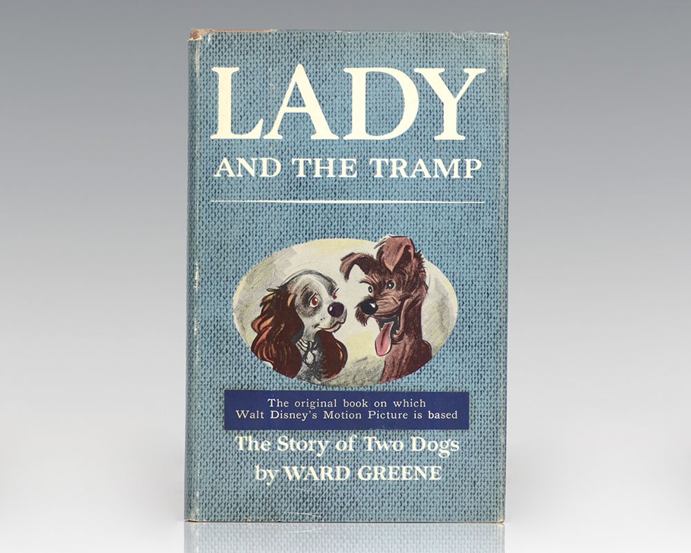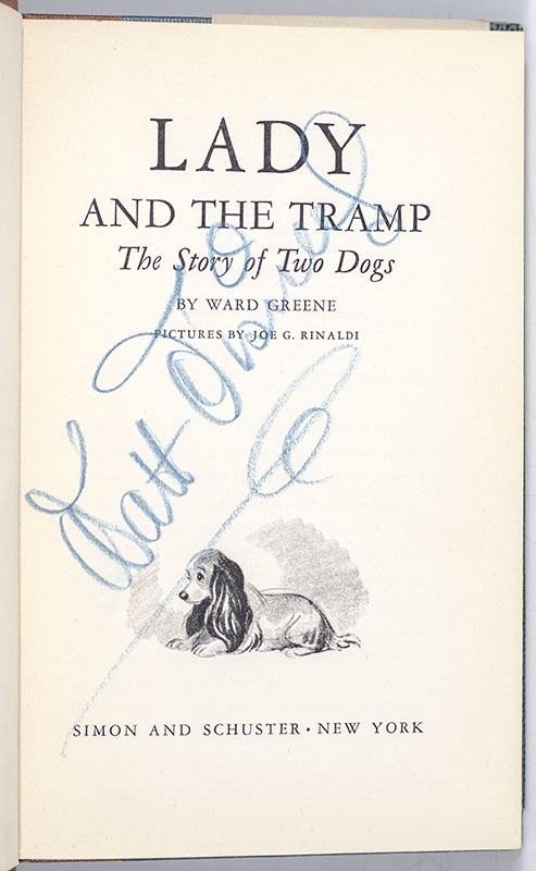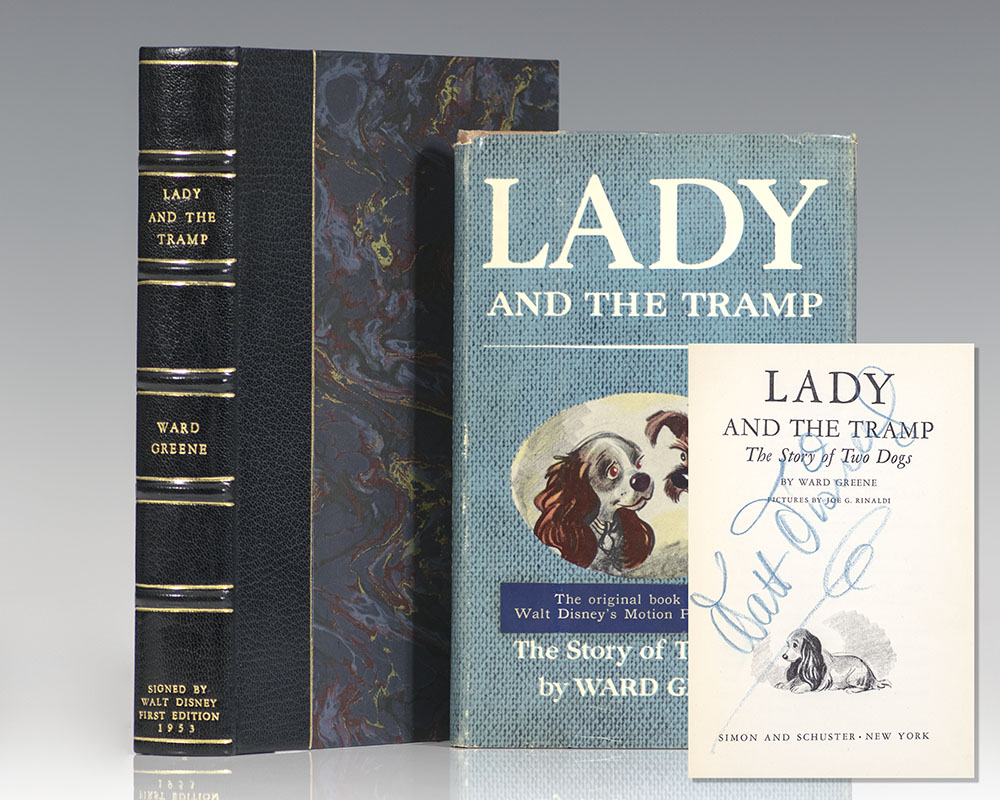 First edition of Lady and the Tramp, boldly signed across the title page by Walt Disney in his usual blue crayon. Octavo, original cloth, with charming illustrations by Joe G. Rinaldi. Foreword by Walt Disney. Fine in a near fine dust jacket with light rubbing and wear. Housed in a custom half morocco clamshell box. Scarce and desirable signed by Walt Disney.