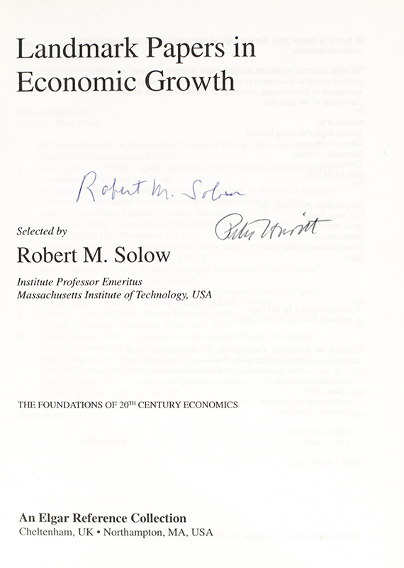 First edition of this collection of writings by Nobel Prize-winning economist Robert M. Solow. Octavo, original cloth. Signed by Nobel Prize-winning economists Robert M. Solow and Peter Howitt on the title page. Howitt contributed an essay in this volume. In near fine condition, issued without a dust jacket.