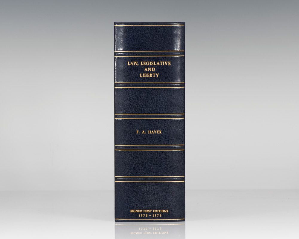 First editions of the economist's magnum opus. Octavo, 3 volumes, original black cloth. Volume one is inscribed on the front free endpaper by F.A. Hayek to his colleague and legal scholar, Theo Mayer-Maly with his bookplate below. Mayer-Maly's work Rechtsgeschichte der Freiheitsidee in Antike und Mittelalter is cited in volume one of Law, Legislation and Liberty. Both volumes two and three are also signed by Hayek. Each volume is fine in near fine dust jackets. We have never seen or handled a complete set signed of this cornerstone work. Housed in a custom half morocco clamshell box. A fine association. Rare and desirable signed and with noted provenance.