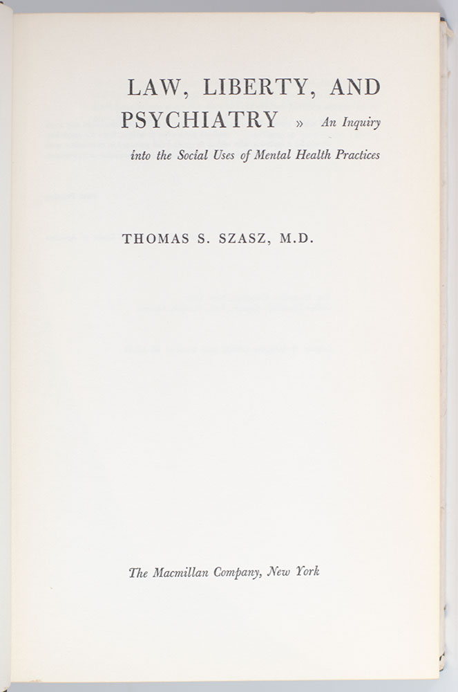 First Edition of Thomas Szasz's Law, Liberty and Psychiatry; From the library of Nobel Prize-winning economist James M. Buchanan