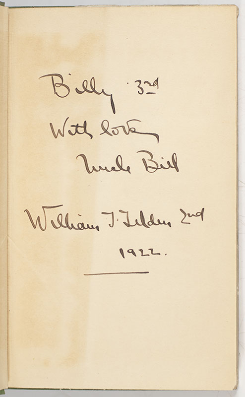 First edition of one of the greatest tennis players of all time, William "Big Bill" Tilden's authoritative guide to lawn tennis for young players. Small octavo, original cloth, illustrated with eleven photographs. Association copy, inscribed by the author on the front free endpaper in the year of publication to his nephew, "Billy 3rd With love, Uncle Bill William T. Tilden 2nd 1922." With an original photograph of Tilden with French one of the biggest tennis stars of the 1920s, tennis champion Suzanne Lenglen, laid in and inscribed by Tilden on the verso, "Susie Longlegs, Pardon me Mlle Suzanne Lenglen & Silly Willie." Near fine in the rare original dust jacket which is in very good condition. First editions in the dust jacket are rare, inscribed association copies exceptionally so.