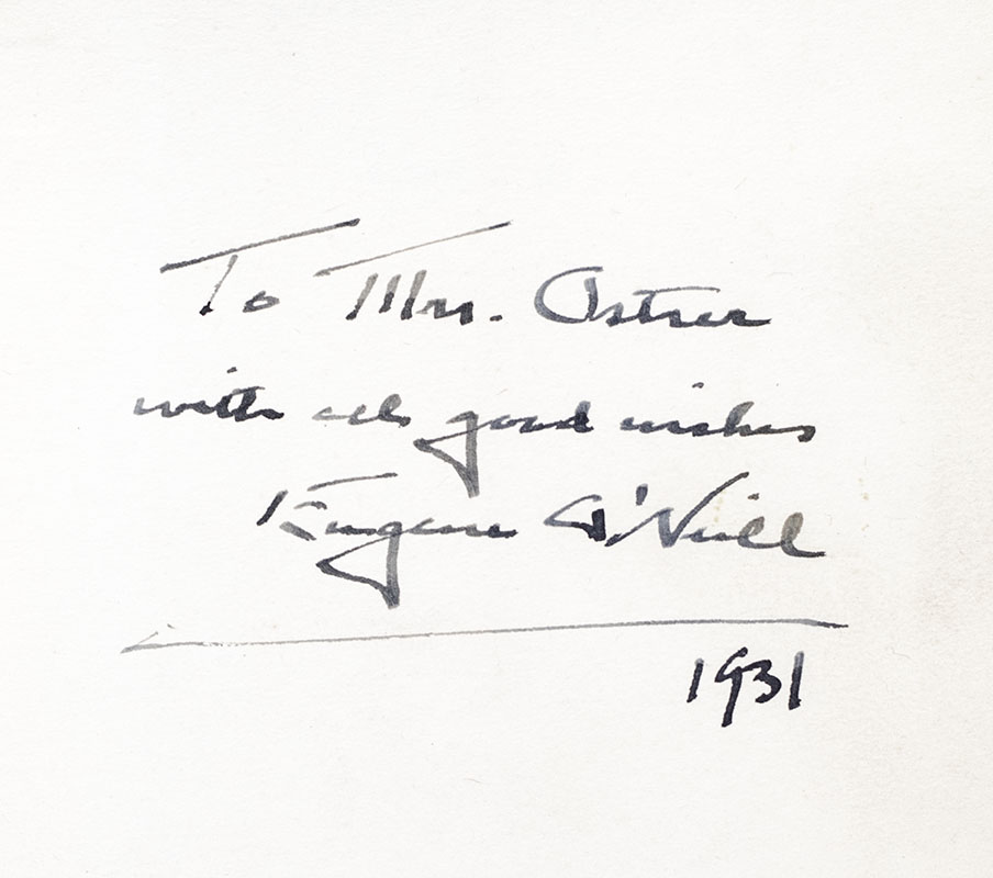 First edition of this collection of two of the great playwright's works including the long theo-philosophical meditation, Lazarus Laughed, which called for more than one hundred actors making up a masked chorus. Octavo, original cloth with gilt titles to the spine, gilt author's signature to the front panel. Presentation copy, inscribed by the author on the front free endpaper, "To Mrs. Oster with all good wishes Eugene O'Neill 1931." Near fine in a very good price-clipped dust jacket.