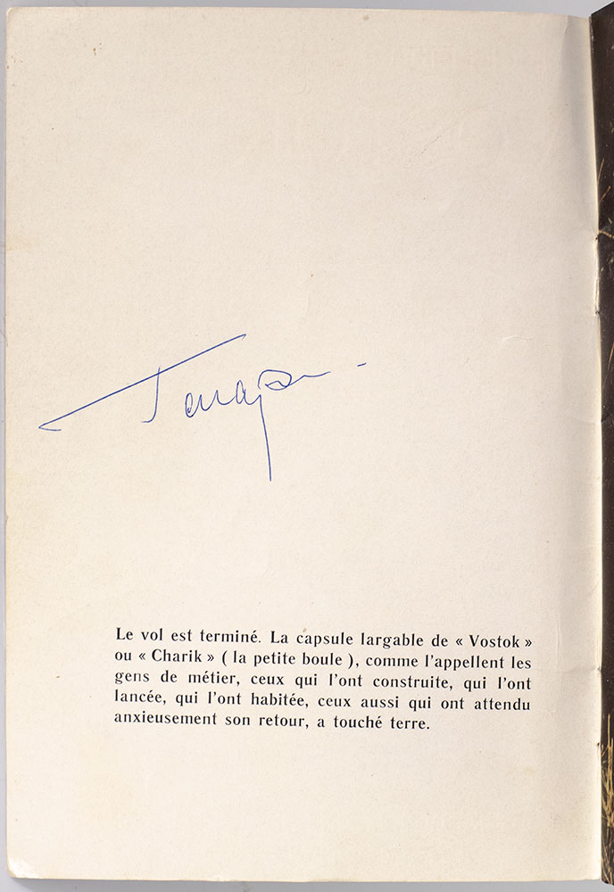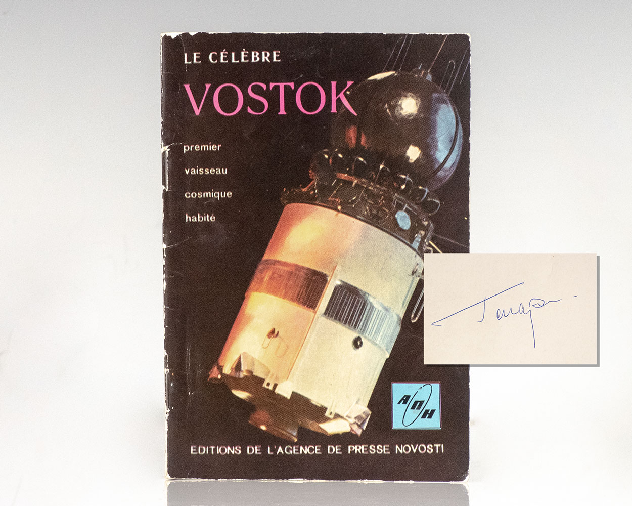 Rare illustrated French pamphlet on the Vostok Research Station, signed by the first human to journey into outer space, Soviet cosmonaut Yuri Gagarin. Octavo, original pictorial wrappers, illustrated with color photographs. Signed by Gagarin on the verso of the front panel. In very good condition. Rare.