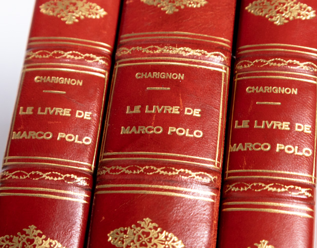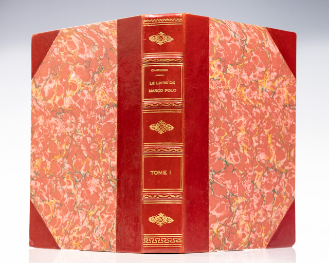 First edition of each volume of French sinologist Antoine Joseph Henri Charignon's monumental work on the life and discoveries of Marco Polo. Quarto, three volumes bound in three quarter polished calf over marbled boards with gilt titles and tooling to the spine in five compartments within raised gilt bands, text in Chinese and French, original light blue wrappers bound in, occasional woodcut head and tail pieces, color-printed folding map of the site of the tomb of Genghis Khan at Tong-kou-luen. No. 188 [Vol. I] of 500 copies on rice papers. No. 183 [Vol. II] of 400 copies on rice paper and No. 41 [Vol. III] of 50 copies on Honan paper. In near fine condition. Rare.