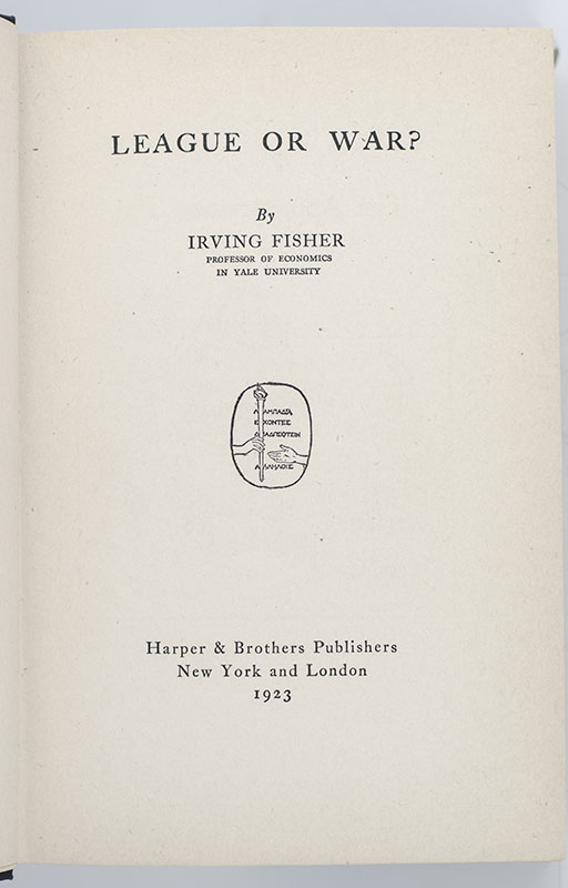 "In short, the United States is to-day the only important civilized nation immediately eligible which is not a member of the League": First edition of Irving Fisher's League or War?; inscribed by him