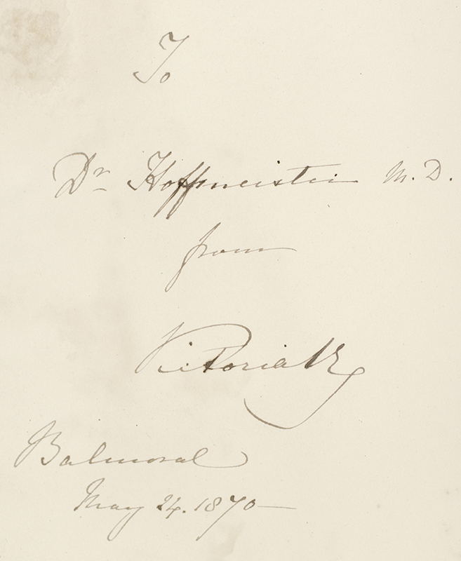 First illustrated edition of Victoria's immensely popular book. Quarto, original red cloth richly decorated in gilt, illustrated. Presentation copy, inscribed by Queen Victoria opposite the half title page, "To Dr. Hoffmeister, from Victoria R, Balmoral, May 24, 1870." The recipient, Sir William Carter Hoffmeister, served as the Medical Attendant to the Queen and Royal Family in the Isle of Wight and at Balmoral. He was knighted in 1884. In near fine condition, rebacked. A splendid edition of this great work.