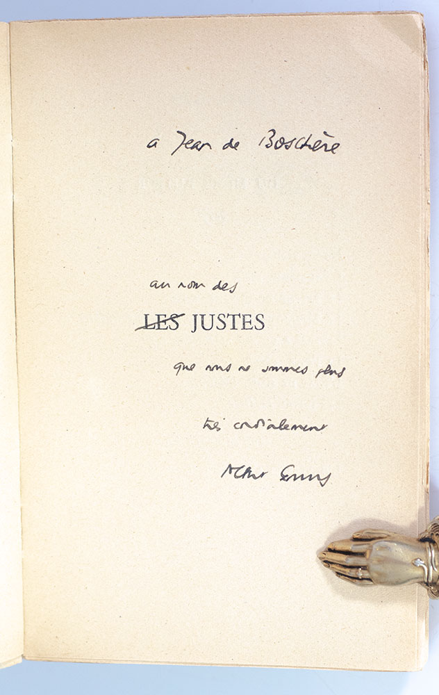First edition, early printing of Camus' classic examination of the moral issues associated with murder and terrorism. Octavo, original wrappers. Presentation copy, inscribed by the author on the half-title page, "A Jean de Bosschère [crossing through "Les"] an nom des que vous no sommes sens tes cordialement Albert Camus." The recipient, Jean de Bosschère lived for most of the 20th century between London and France, and illustrated his own works as well as the works of Oscar Wilde, Charles Baudelaire, and the classical works of Aristophanes, Ovid, Strato and Apuleius. He published his own works of poetry, and in 1952 was awarded the Prix de la Méditerranée and in November the Mandat des Poètes. In near fine condition.