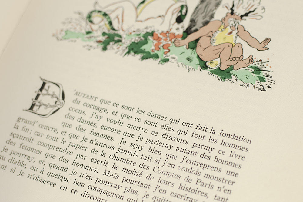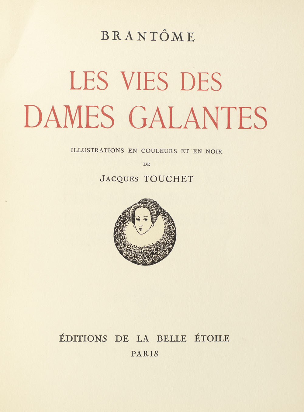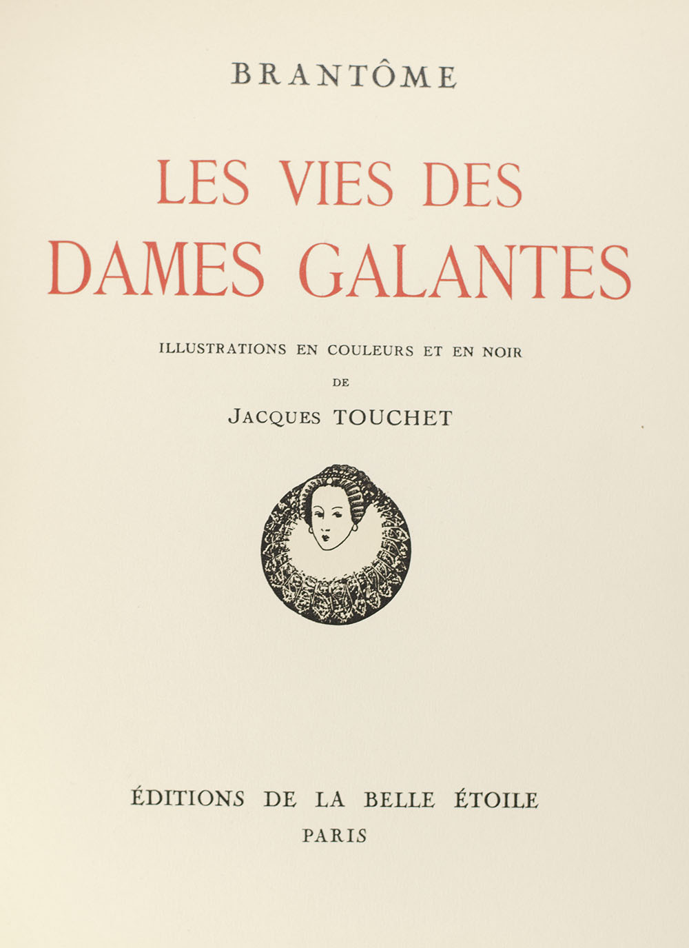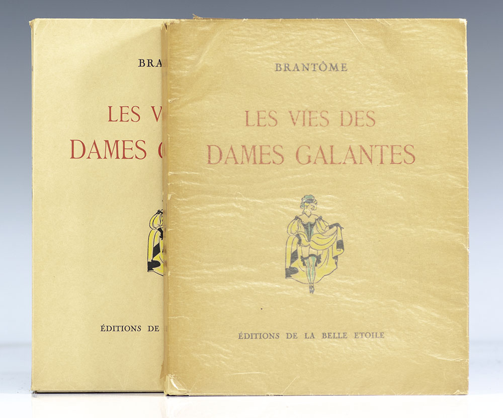 First edition of Brantôme's sensational work on 17th century Parisian court life. Quarto, 2 volumes, original wrappers, illustrations in color by Jacques Touchet. One of 1250 numbered copies. this is number 940. In near fine condition. Housed in a custom half morocco clamshell box. Rare, particularly so in the original wrappers.