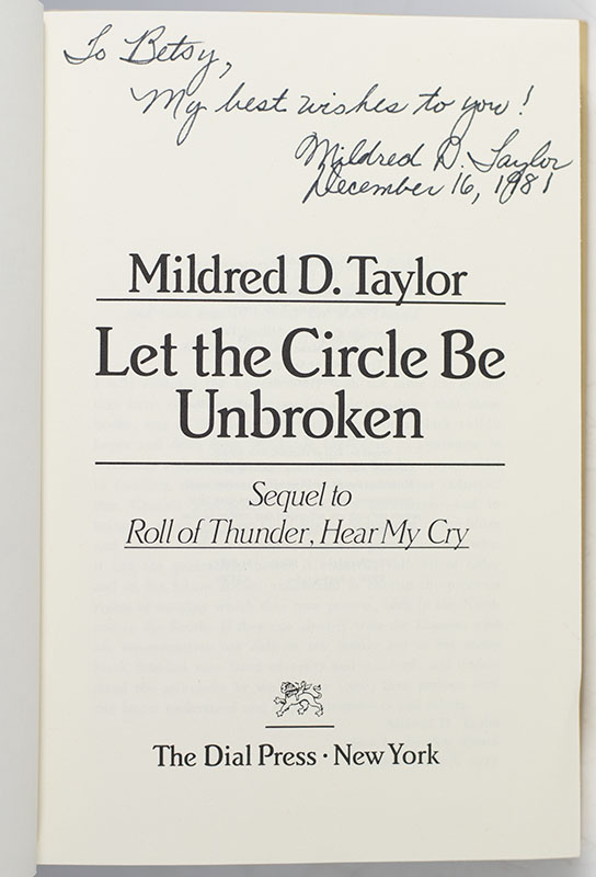 First Edition of Mildred Taylor's Let the Circle Be Unbroken: Sequel to Roll of Thunder, Hear My Cry; Inscribed by Her in the year of Publication