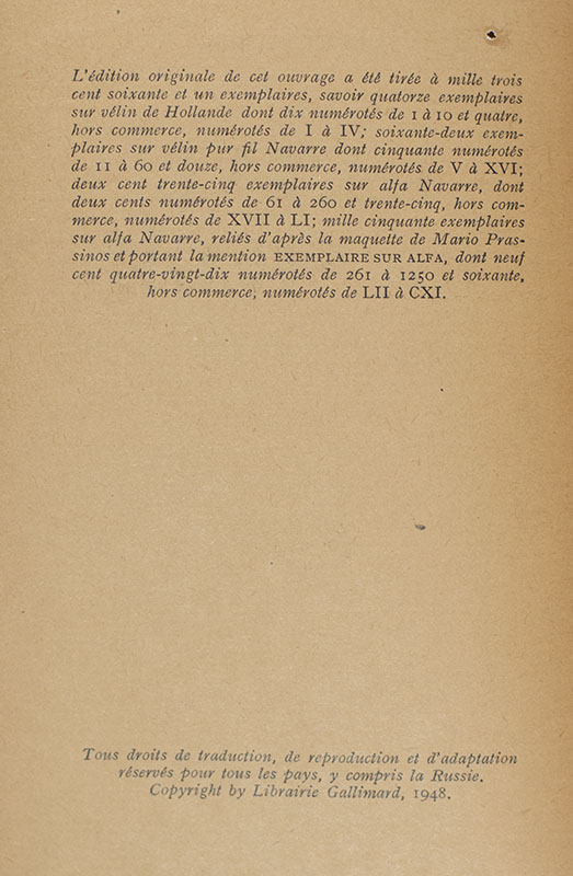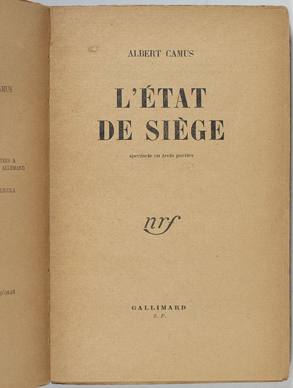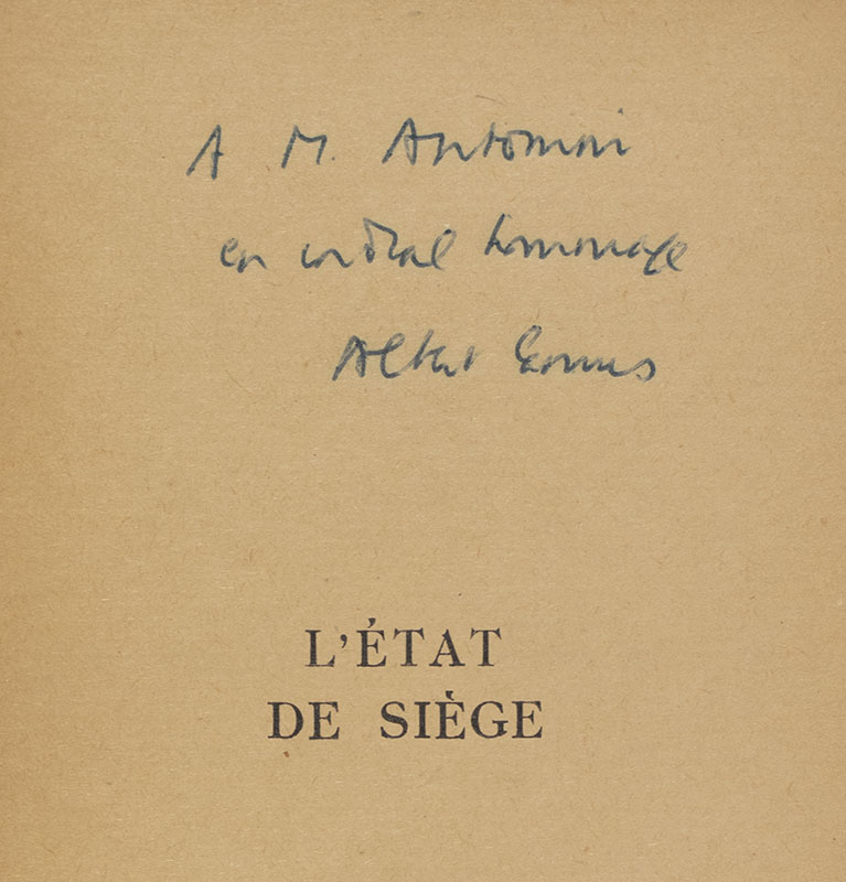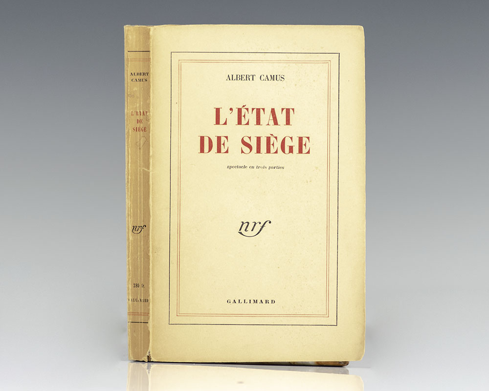 First edition of this classic play by the Nobel Prize-winning author. Octavo, original wrappers. Presentation copy, inscribed by the author on the half-title page, “A. M. Antomin en cordial hommage Albert Camus.” In near fine condition. Housed in a custom half morocco clamshell box.