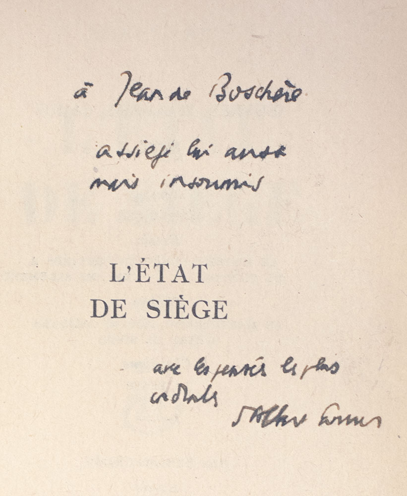 First Edition of Albert Camus' L'État de Siège; warmly inscribed by him to Jean de Bosschère