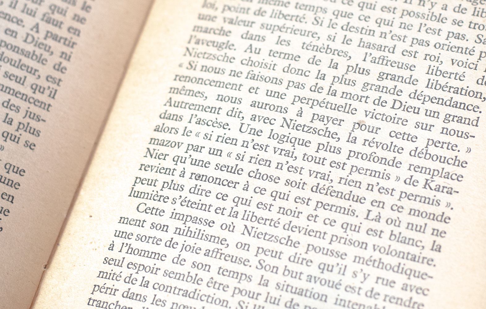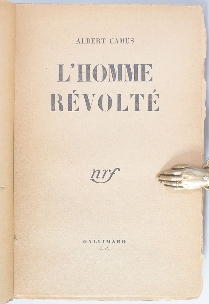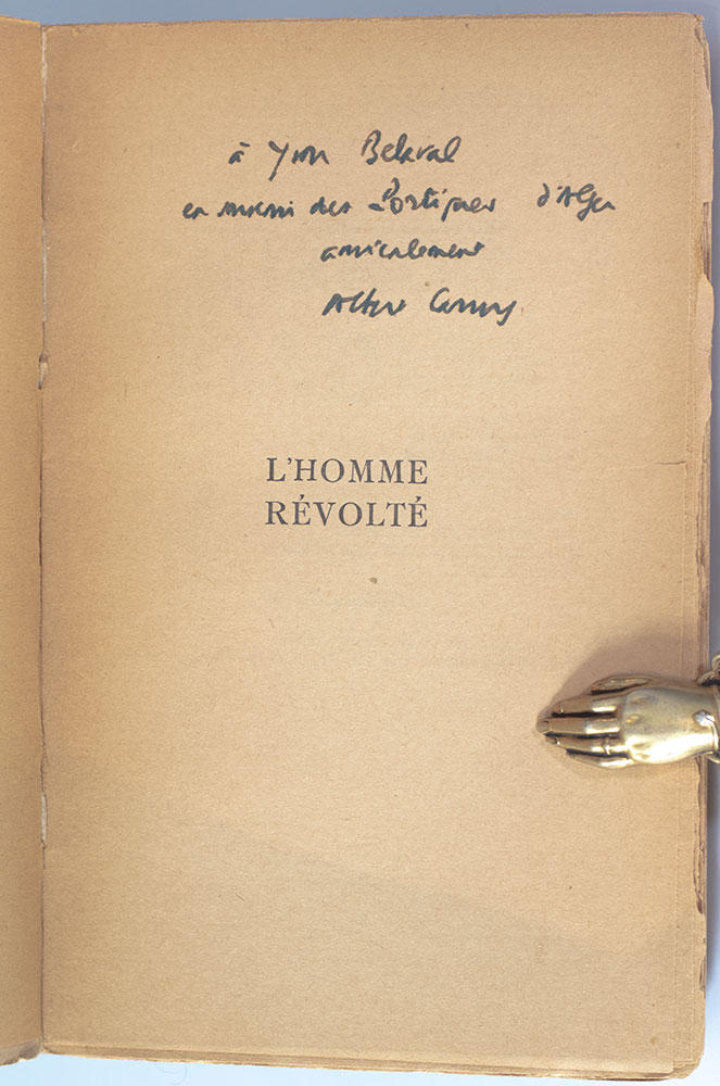 First edition, review copy (marked "S.P." on title-page and lower wrappers) of one of Camus' most notable works. Octavo, original wrappers as issued. Presentation copy, inscribed by the author on the half-title page, "A Yvon Belaval en souvenir des Portiques d'Alger, amicalement Albert Camus." The recipient, French philosopher and literary scholar Yvon Belaval, was a specialist in 18th century French philosopher Denis Diderot and edited an important edition of Diderot's works with fellow philosopher Jean Grenier, one of Camus' most influential mentors to whom he dedicated the present volume. Camus became a student of Grenier's in Algiers and was strongly influenced by his work Les Îles, published in 1933. He dedicated his first book to Grenier: L'envers et l'endroit, published in Algeria by Edmond Charlot. L'homme révolté was also dedicated to Grenier, and Camus provided the preface to the second edition of Les Îles in 1959. In near fine condition. A unique association copy.