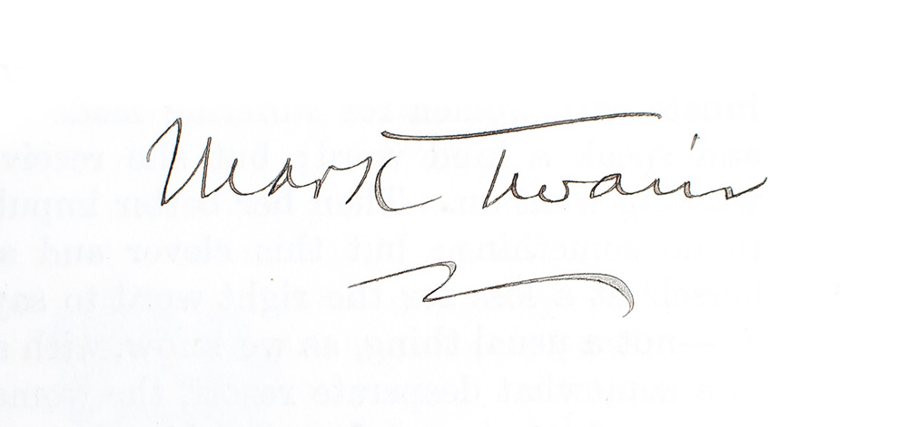 "The Authors Club of New York, organized in 1882, was a social club for like-minded men and a support group for younger writers. In 1891, club members conceived Liber Scriptorum as a means to raise money for a suitable permanent home. Each member contributed an original essay, story or poem that would never be published elsewhere. Each author signed 251 copies of his entry, and the books were then bound. The book, published and printed by club member Theodore Low De Vinne, sold for $100—almost $2000 in 2002 dollars. De Vinne donated the work at cost, and the club enjoyed a profit of $10,500. By the time the book was finished and the profit realized, Andrew Carnegie had given the club a suite of rooms in his building at 57th and Seventh Avenue, and the publication proceeds were used to furnish the rooms" (Carnegie Mellon University). Liber Scriptorum marks the first appearance in print of Twain's tale about an unfortunate man's undying devotion to his wife; contrary to the club's original plans, this story was later included in The $30,000 Bequest and Other Stories (1906). Other contributors include De Vinne, William Dean Howells, Henry Van Dyke and Frank R. Stockton. Though "there are presumed to be 251 copies of the book; actually, over 30 of these were not bound but were sold as separate articles" (Johnson, 128). BAL 3438
