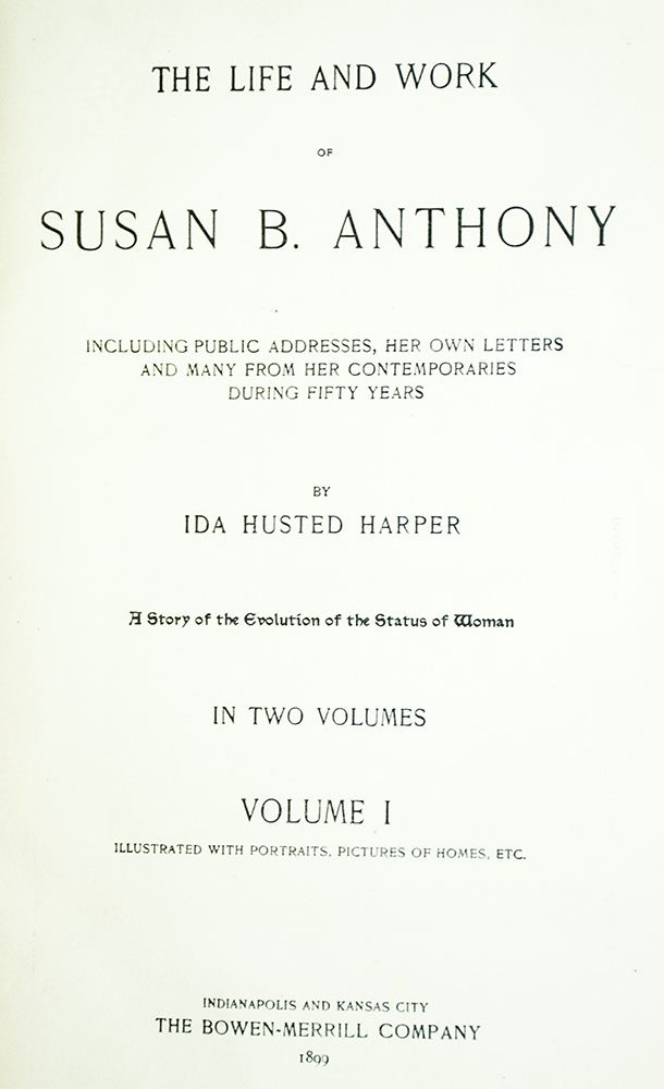 First editions of Anthony's classic biography. Octavo, 2 volumes, original cloth, gilt titles to the spine, gilt medallion to the front panels of both volumes. Volume one is lengthily inscribed by Susan B. Anthony on the front free endpaper as follows, "To Mrs. Grace Bartholomew, Pioneer, Michigan, I present these volumes because of dear Mr. D.A. Blodgett's purchasing so many Histories of Woman Suffrage to give to his friends. Therefore please accept these for his sake, & oblige. Yours very sincerely, Susan B. Anthony, Rochester N.Y., Nov. 5, 1904." Delos Abiel Blodgett of Grand Rapids, MI founded an orphanage which remains active today. Grace Richmond Bartholomew (1848-1920) was a farmer of Pioneer, Michigan.