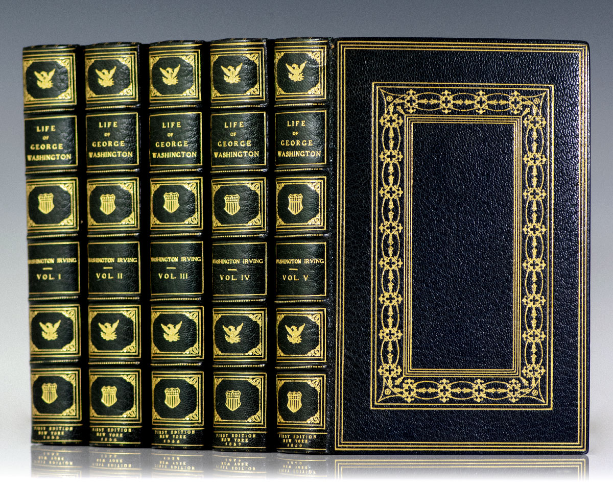 First edition of Irving’s monumental biography of George Washington. Octavo, bound in full crushed navy morocco with gilt titles and tooling to the spines, elaborate gilt ruling to the front and rear panels, gilt turn-ins and inner dentelles, marbled endpapers, top edges gilt, tissue-guarded frontispiece portrait of Washington, original cloth bound in at rear of each volume. In near fine condition. A very attractive set.