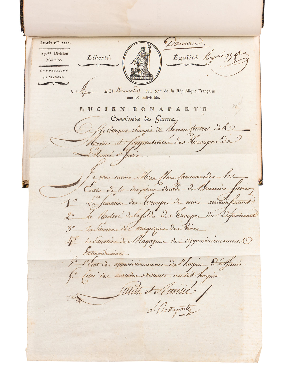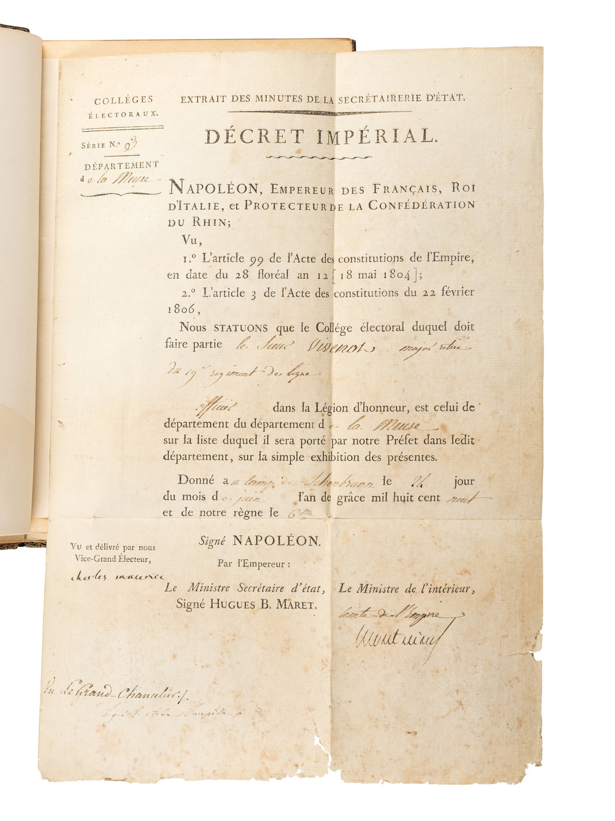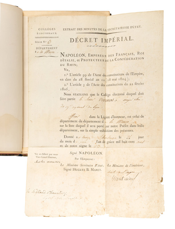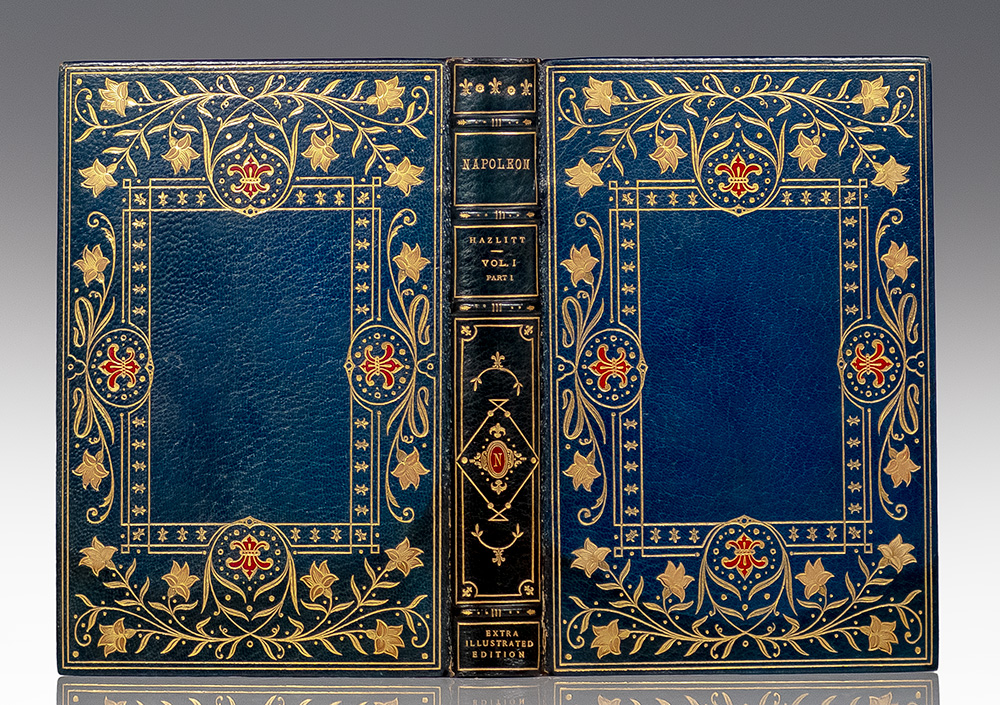 The Napoleon Series extra illustrated edition of the Life of Napoleon, limited to five numbered copies of which this is number 2 and extra-illustrated with the addition of 32 documents and a profusion of engraved plates. Octavo, 32 volumes elaborately bound in contemporary blue crushed levant morocco gilt by Erbe, Crombie & Lamothe with a floral and fleur-de-lis motif and red and tan morocco onlays, gilt titles and tooling to the spines in five compartments within raised gilt bands, gilt inner dentelles stamp-signed by Erbe, Crombie & Lamothe, navy and red morocco gilt doublures, silk ribbons bound in, top edges gilt. Limited edition, number 2 of 5 numbered copies of the "Extra Illustrated Edition." The set includes: Hazlitt, William. Life of Napoleon Bonaparte. 12 volumes; Bourrienne, Louis Antoine Fauvelet de (1769-1834). Life Of Napoleon Bonaparte. 8 volumes; Junot, Laure, Duchesse D'abrantes (1784-1838). Memoirs Of Madame Junot. 12 volumes. Extra illustrated by the addition of 32 documents and a profusion of engraved plates. Original documents neatly bound in near the front of each volume, including Napoleonic period documents (ca 1790-1830), including: [Bonaparte, Napoleon (1769-1821)]. Printed document signed ("Bonaparte"), Premier Consul de la Republique Française. N.p, ca 1804-1807. 1 page, folio, on paper with seal. "Au Nom du Peuple Francais," regarding convening an assembly of the First Consul of the French Republic. With the signatures of Comte de Chanteloup Jean-Antoine Chaptal, (1756-1832), as Minister of the Interior, and Duc de Bessano Hughes-Bernard MARET (1763-1839) as Secretary of State. -- Talleyrand-Perigord, Charles-Maurice de (1754-1838). Partially printed accomplished document in manuscript signed ("Charles Maurice"), as Vice-Grand Electeur de l'Empire. N.p., ca after 18 May 1804. 1 page, 4to, on paper with embossed seal design. "Extrait des Minutes de la Secrétairerie D'etat. Décret Imperial," regarding the electoral college, series No. 3, with the signatures of a "Comte de l'Empire" as the Minister of the Interior, and a "Vu de Grand-Chevalier." -- BONAPARTE, Lucien (1775-1840). Autograph document signed ("L. Bonaparte"), as Commissaire des Guerres. Ajaccio, [Corsica, Italy], 21 Brumaire l'an VI [Tuesday, 11 November 1797]. 1 page, 4to, on his "Liberte. Egalite" letterhead stationery with the engraved symbol of the French Republic, accomplished in manuscript. Regarding orders pertinent to the Liamone Subdivision of the Army of Italy troops. And 29 others. In near fine condition. A stunning set.